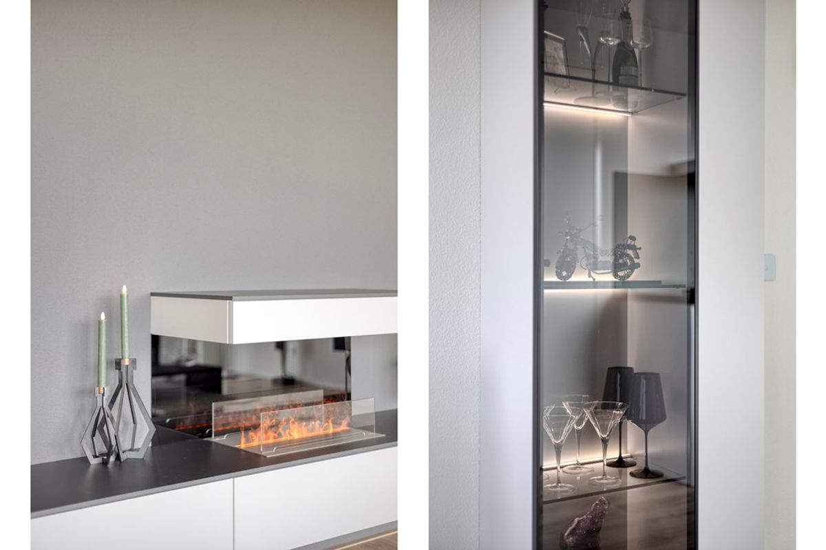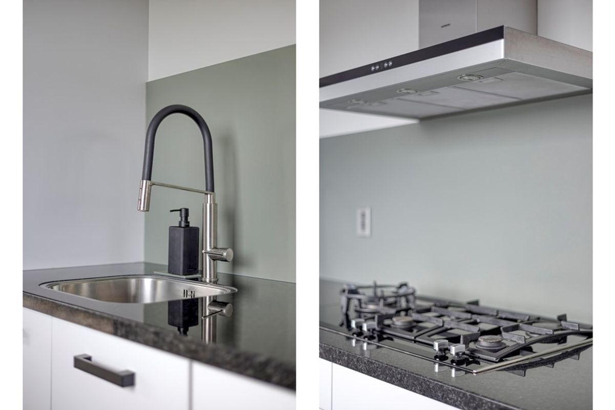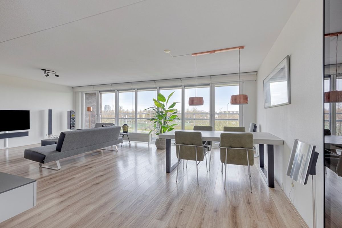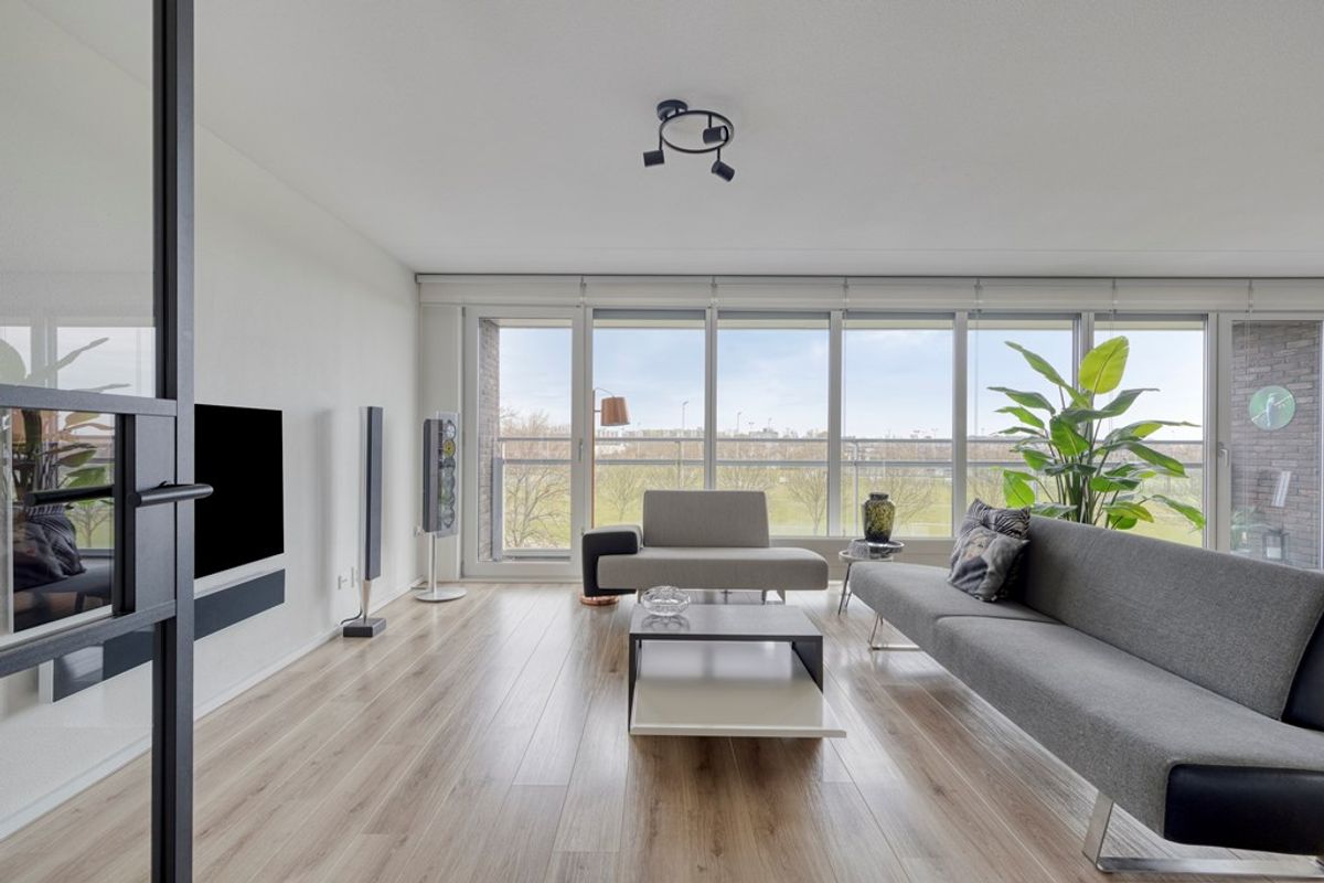 De woonkamer aan de voorzijde is zonder twijfel één van de absolute blikvangers van het appartement. Dankzij de prachtige glazen wand stroomt het daglicht rijkelijk naar binnen en geniet u van een weids en vrij uitzicht op het groen. Dit geeft de ruimte niet alleen een bijzonder lichte uitstraling, maar ook een open en ruimtelijk karakter dat direct aanspreekt. De ramen aan de voorkant zijn voorzien van screens. Hier is volop plaats voor een comfortabele zithoek en een gezellige eethoek, waardoor het een heerlijke leefruimte is voor zowel ontspannen avonden thuis als het ontvangen van familie en vrienden. De open keuken sluit hier perfect op aan en maakt van het woongedeelte een sfeervol geheel. De keuken is uitgevoerd met luxe inbouwapparatuur en biedt alle comfort voor wie van koken en gezellig samenzijn houdt. Praktisch, stijlvol en volledig passend bij het moderne karakter van de woning.