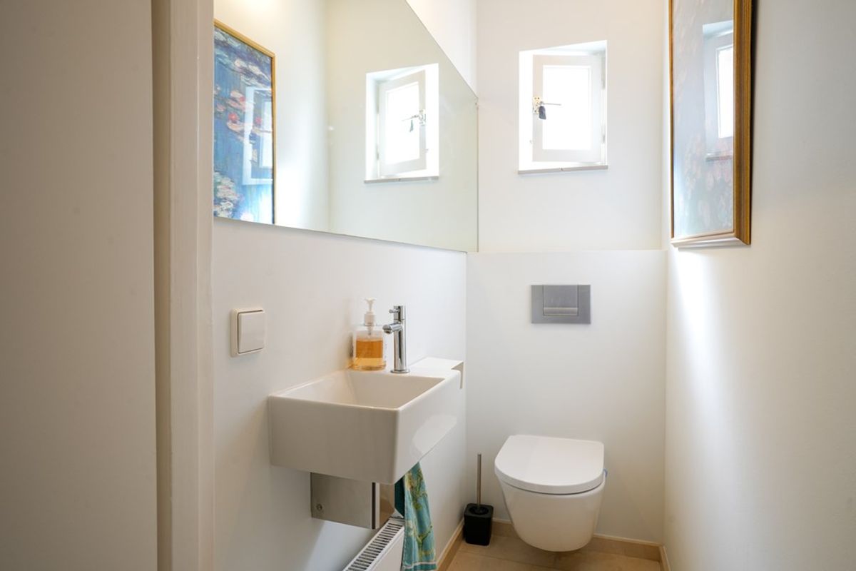 Aan de linkerzijde, bij de oprit, is de overdekte entree van deze verrassende woning. De kunststof voordeur geeft toegang tot de hal, met de trap naar de eerste verdieping. Ook de trap naar het souterrain bevindt zich in de hal, achter een van de mooie deuren. De toiletruimte is uitgevoerd met fraaie vloertegels, stucwerk, een wandcloset en een fonteintje.