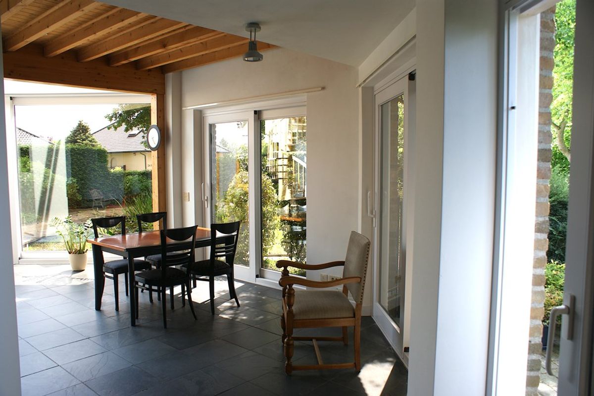 Vanuit de keuken stap je zo het ruime terras op, waar je kunt genieten van lange zomeravonden. Daarnaast beschikt de tuin over een tweede terras, een grasveld met fruitbomen en volop ruimte voor ontspanning, spel of zelfs het realiseren van een zwemvijver.