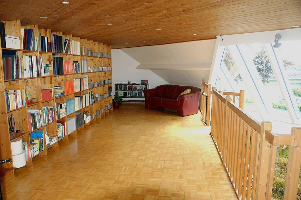 De vide op de eerste verdieping geeft een prachtig zicht op de woonkamer en de tuin. Hier vind je een indrukwekkende bibliotheekkast, een ideale plek om te ontspannen en te genieten van het uitzicht.