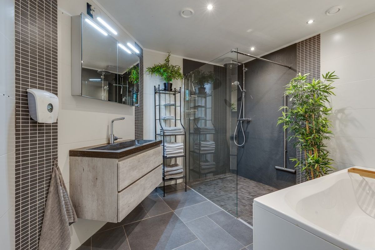 De woning beschikt over een moderne badkamer op de begane grond, volledig voorzien van hedendaags comfort. De ruimte is uitgerust met een inloopdouche, ligbad en een stijlvol wastafelmeubel, wat een luxe en verzorgde uitstraling geeft. Dankzij de indeling en afwerking is dit een aangename plek om te ontspannen en de dag te beginnen of af te sluiten.