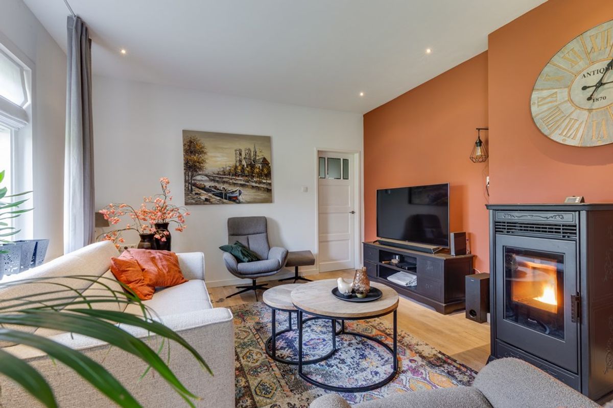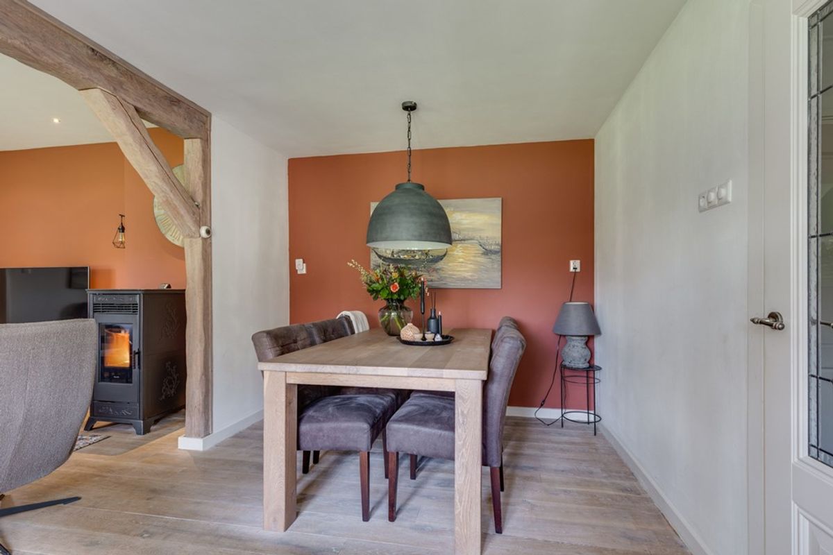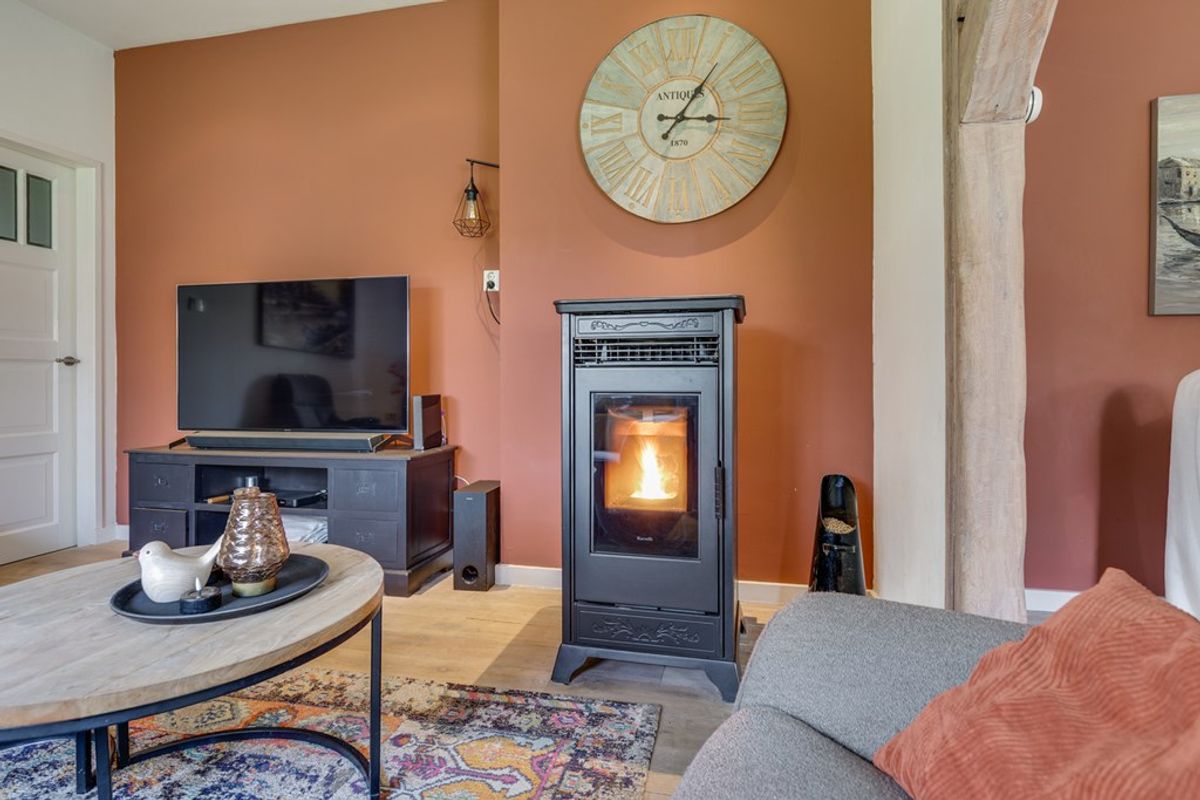De woonkamer biedt een prettige leefruimte met veel lichtinval en een fraai uitzicht op het omliggende groen. Dankzij de praktische indeling is er voldoende ruimte voor zowel een comfortabel zitgedeelte als een gezellige eethoek, waardoor het een fijne plek is voor het hele gezin. In de woonkamer bevindt zich tevens een pelletkachel, die is aangesloten op de cv-installatie en bijdraagt aan een aangename en energiezuinige verwarming.