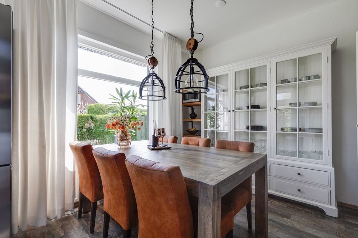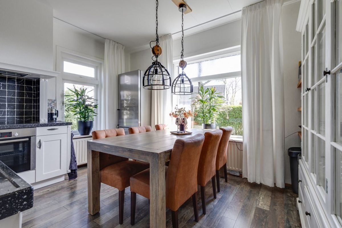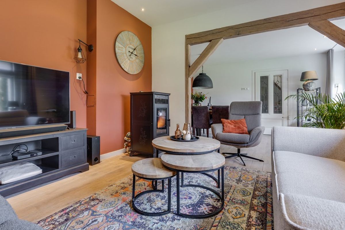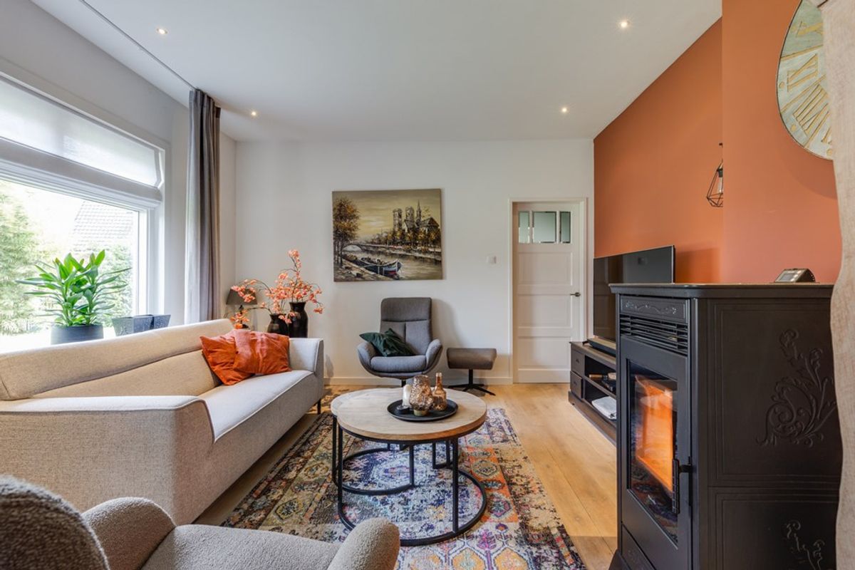 De woonkamer biedt een prettige leefruimte met veel lichtinval en een fraai uitzicht op het omliggende groen. Dankzij de praktische indeling is er voldoende ruimte voor zowel een comfortabel zitgedeelte als een gezellige eethoek, waardoor het een fijne plek is voor het hele gezin. In de woonkamer bevindt zich tevens een pelletkachel, die is aangesloten op de cv-installatie en bijdraagt aan een aangename en energiezuinige verwarming.