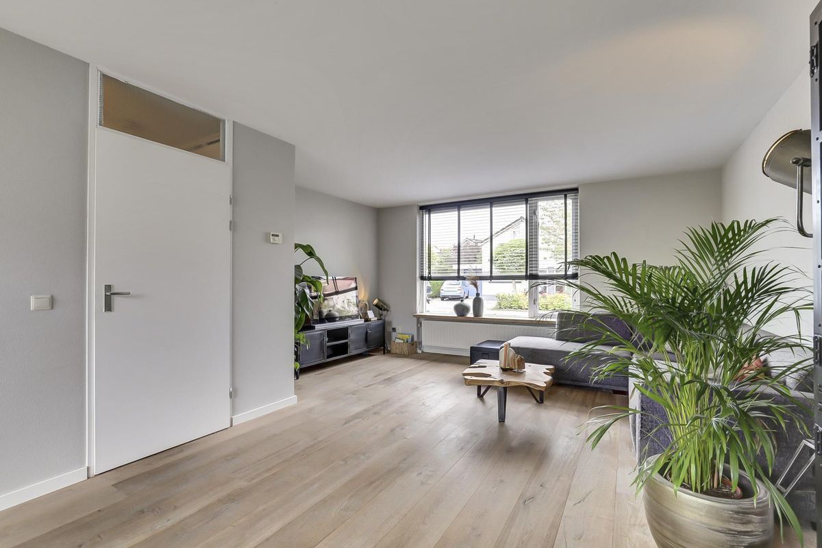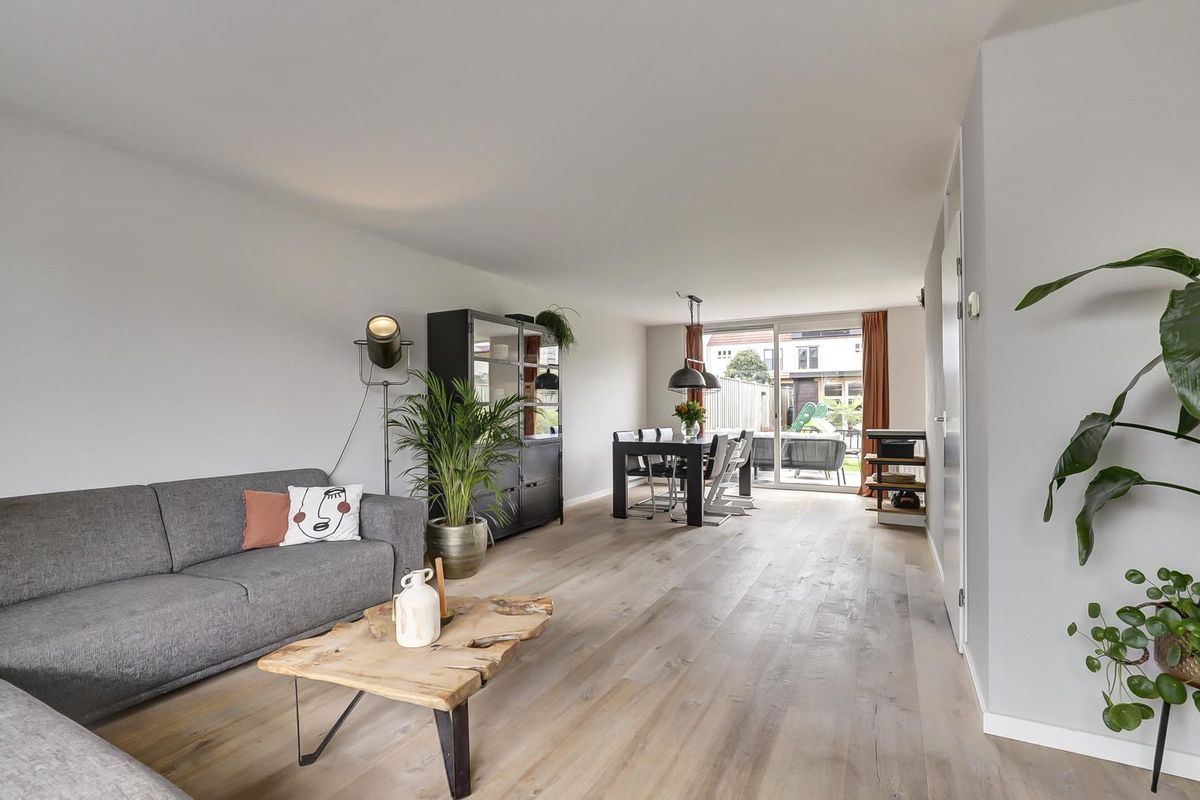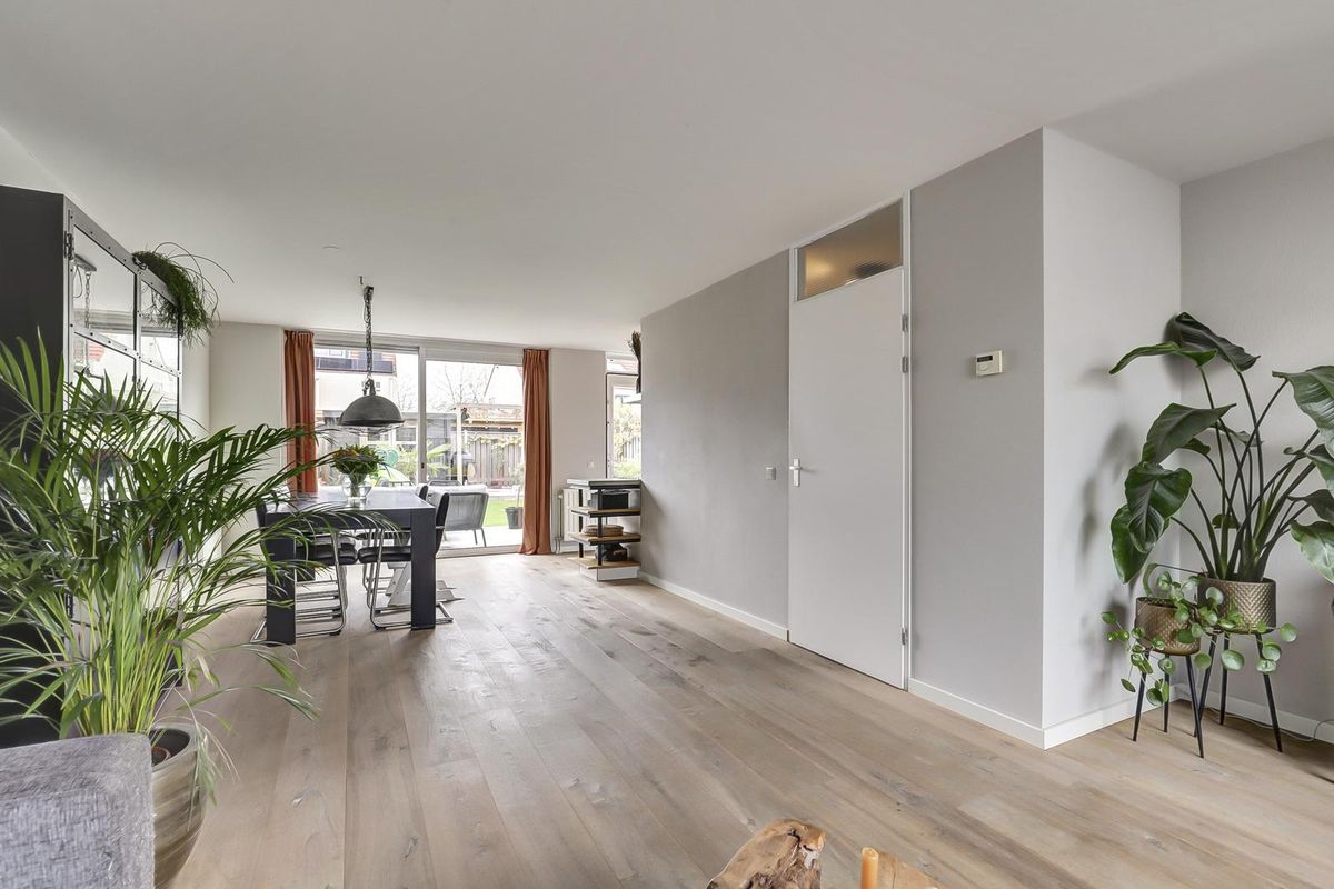 Via de ruime entree met meterkast, toilet en trapopgang betreedt u de lichte woonkamer. De woonkamer strekt zich uit over de volledige diepte van de woning en heeft een fraaie, lichte houten vloer. Dankzij de grote ramen aan de voor- en achterzijde valt er veel daglicht binnen, wat zorgt voor een aangename, open sfeer. Aan de voorzijde vindt u de gezellige zithoek, terwijl aan de achterzijde de eethoek een prachtig uitzicht biedt op de tuin.