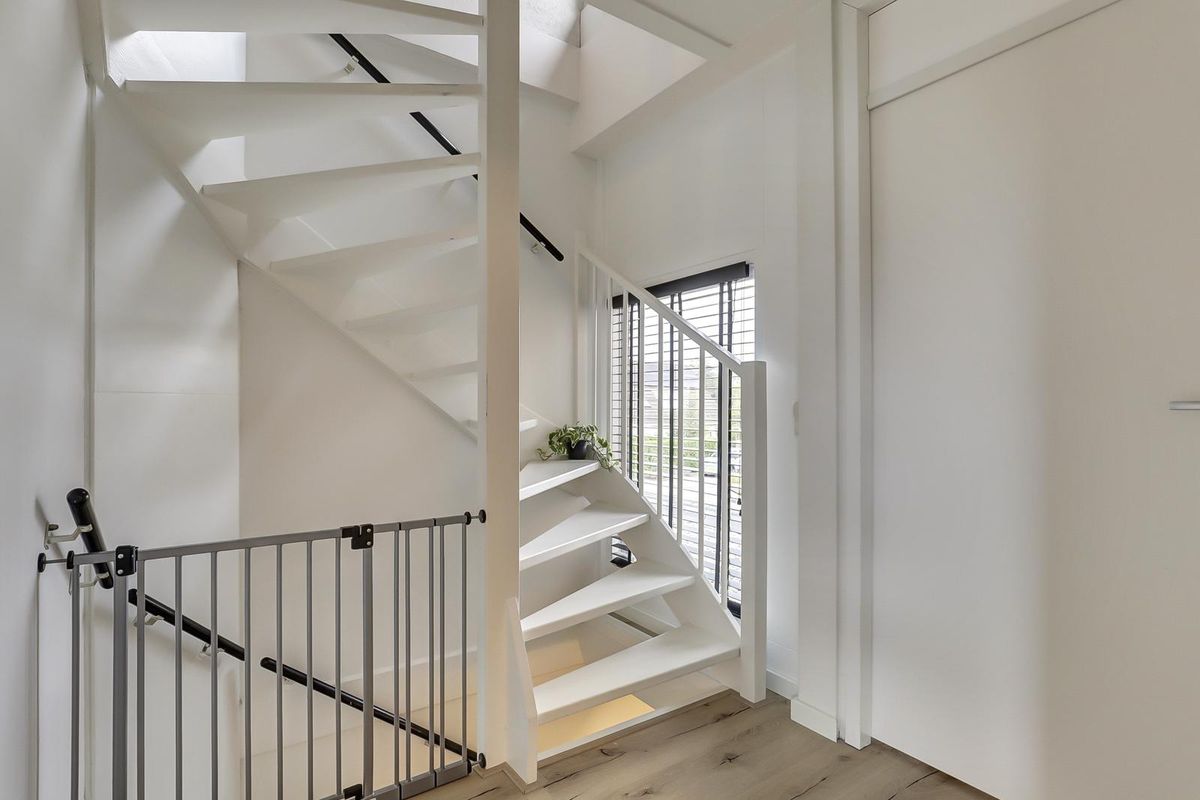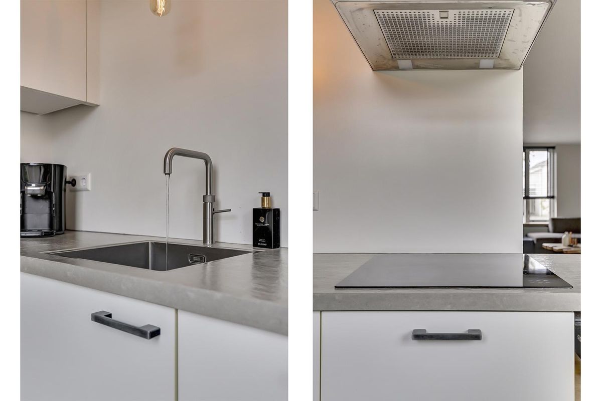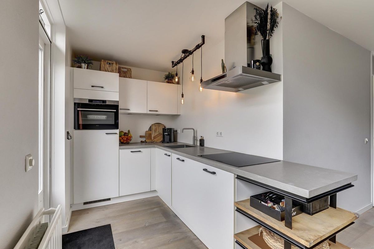 De moderne open keuken is uitgevoerd in strak wit met een licht werkblad en voorzien van hoogwaardige inbouwapparatuur: een inductiekookplaat met afzuigkap, stoom-oven, spoelbak met Quooker-kraan, vaatwasser en koel-vriescombinatie. Vanuit de keuken heeft u direct toegang tot het terras en de achtertuin, ideaal voor wie graag buiten leeft.