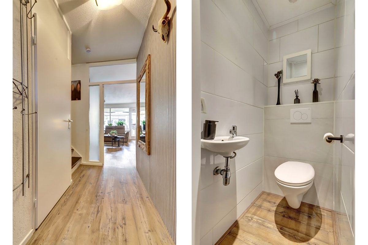 Via de entree bereik je de ruime hal met toiletruimte, voorzien van een zwevend toilet en fonteintje. Vanuit de hal is de inpandige berging bereikbaar, die tevens een eigen buitendeur heeft. In deze praktische ruimte bevinden zich onder meer de meterkast en de aansluiting voor de wasmachine en droger.