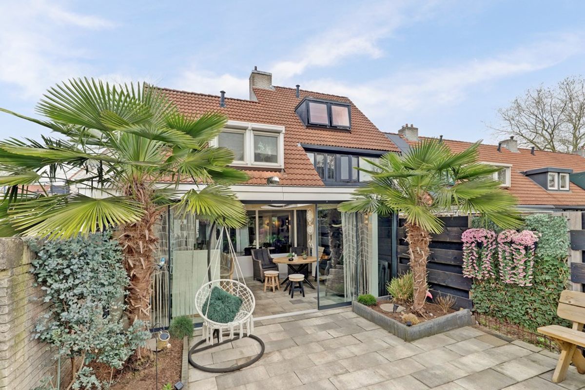 De achtertuin is verzorgd aangelegd en grotendeels bestraat. In de borders staan twee flinke palmbomen, wat de tuin een mediterrane uitstraling geeft. Daarnaast beschikt de tuin over een houten berging met overkapping en een praktische poort aan de rechterzijde.