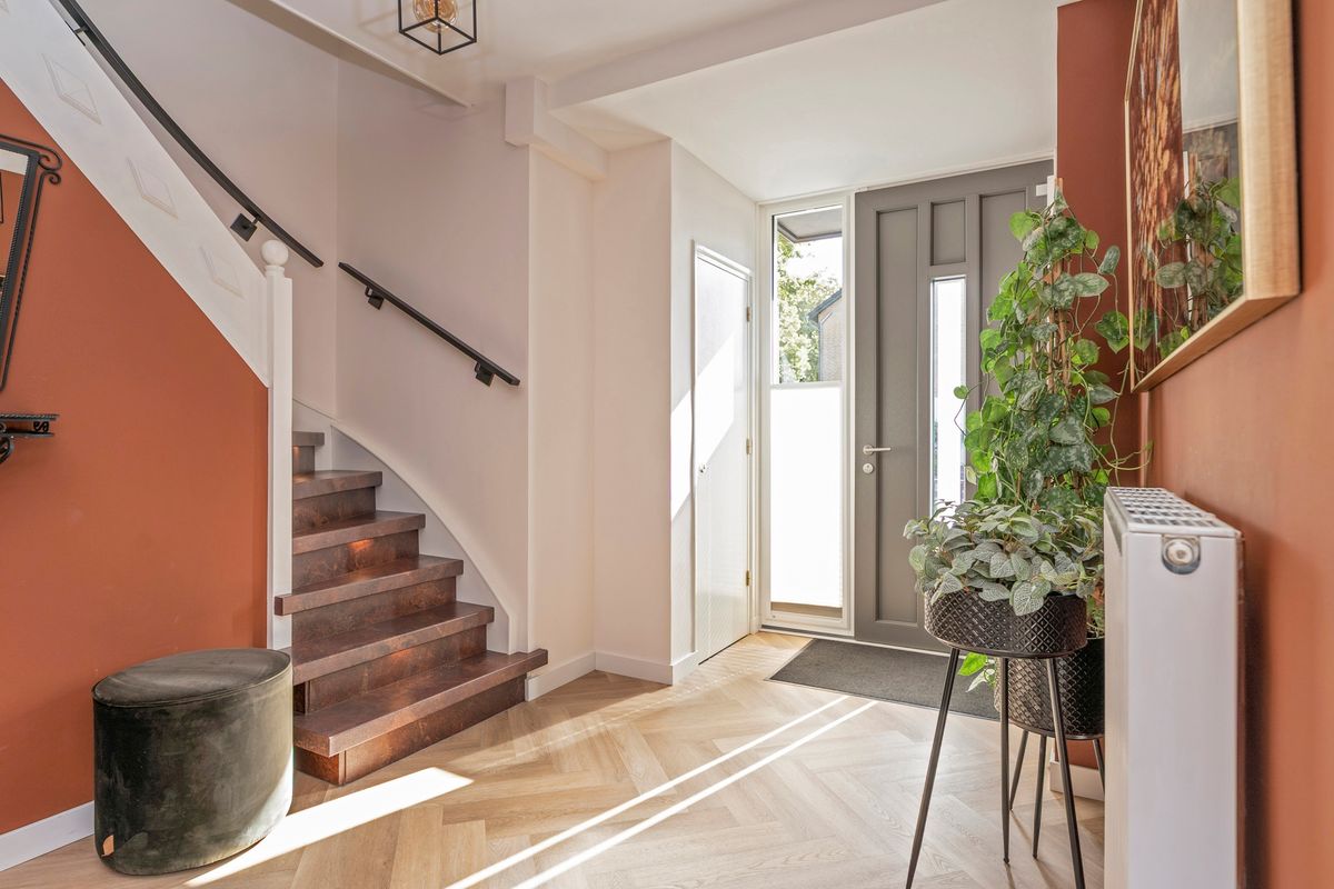 Ruime, sfeervolle entree/hal met meterkast, toilet voorzien van een hangcloset met fonteintje, garderobe en bergruimte onder de trap en de trapopgang naar de 1e verdieping.