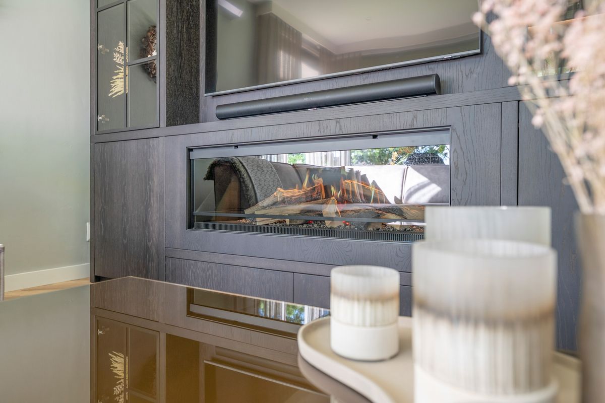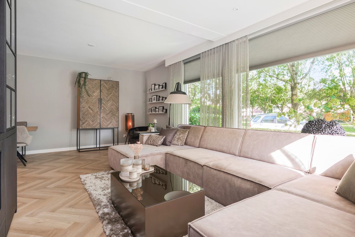 Smaakvolle woon/eetkamer welke voorzien is van grote ramen welke zorgen voor optimale lichtinval en prachtig uitzicht over een brede groenstrook. De aanwezigheid van prachtige deuren biedt de mogelijkheid om het woonkamer gedeelte te scheiden van het keuken / kantoor gedeelte en in alle rust te kunnen werken.