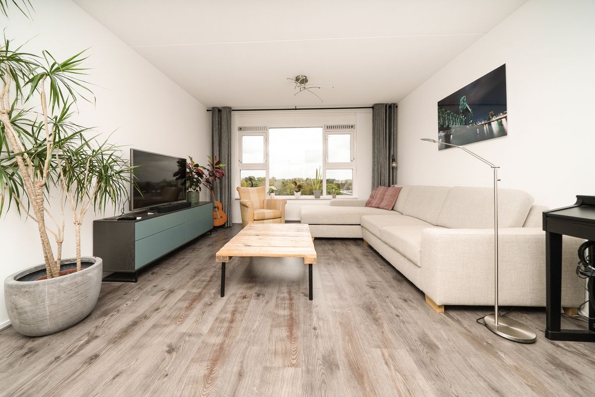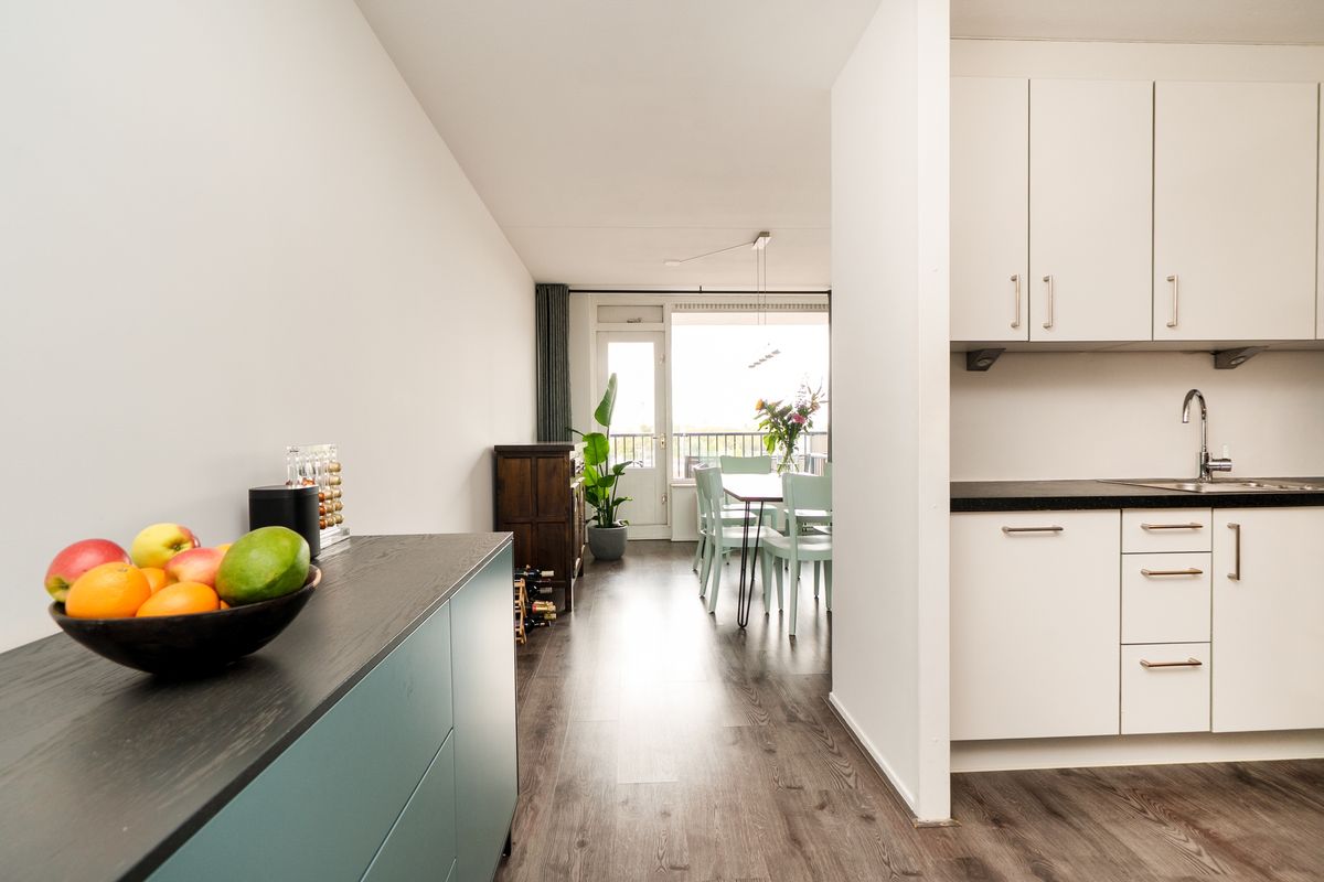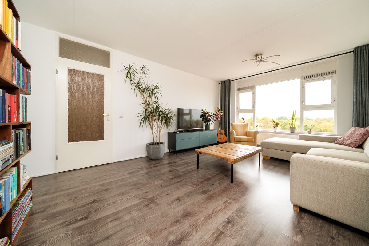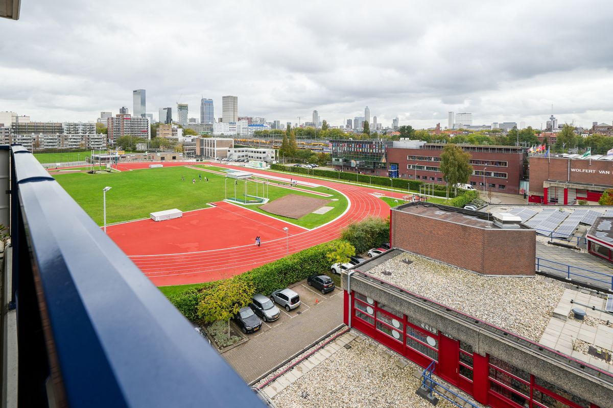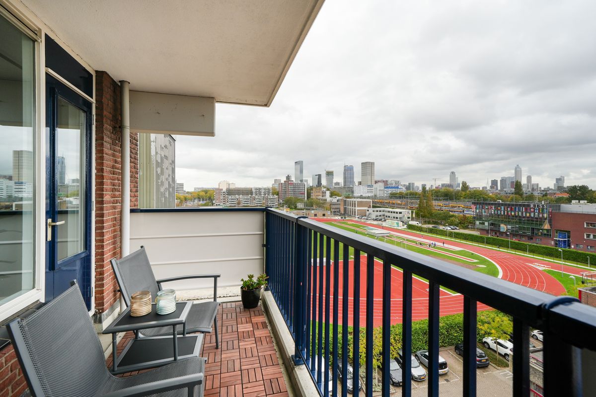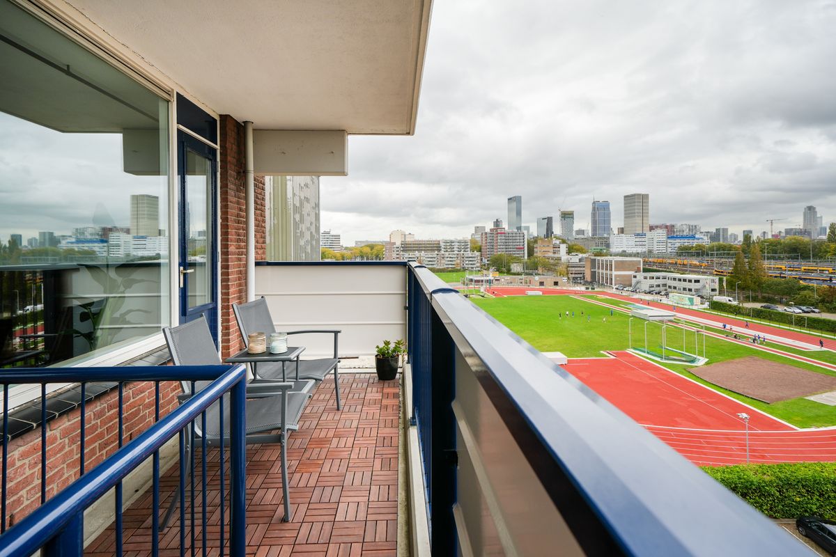 Het balkon op het zuiden is een heerlijke plek om te ontspannen. Hier geniet je de hele dag van de zon en van het vrije uitzicht richting het centrum van Rotterdam en de atletiekvelden van Nenijto.