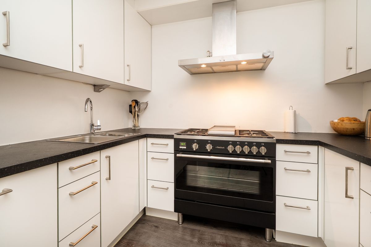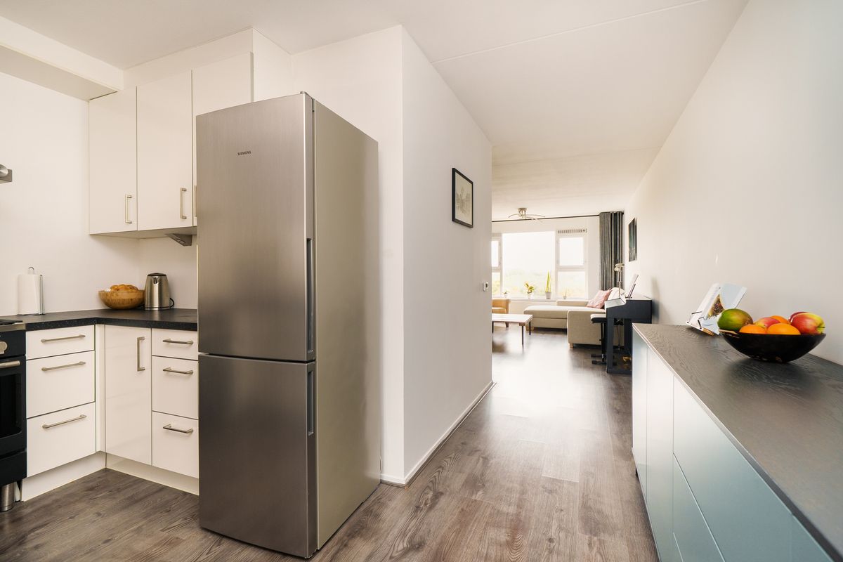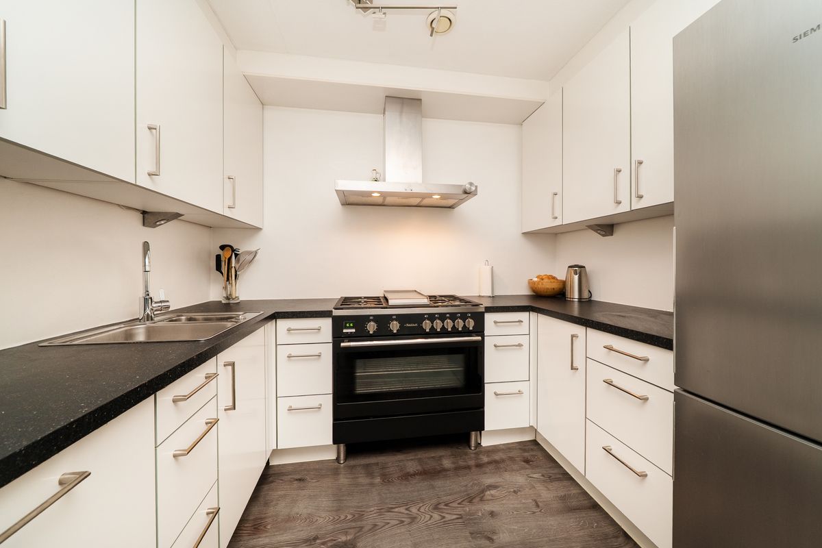 De keuken vormt het hart van de woning en is slim gesitueerd tussen de woon- en eetkamer. De praktische U-opstelling biedt veel werk- en opbergruimte en is uitgevoerd in fris wit met aluminium accenten en een stijlvol zwart aanrechtblad. De keuken is volledig uitgerust met een 5-pitsgasfornuis met grillplaat, brede oven, afzuigkap en vaatwasser. De losse koel-/vriescombinatie is ter overname. Daarnaast heeft de keuken een dubbele spoelbak.