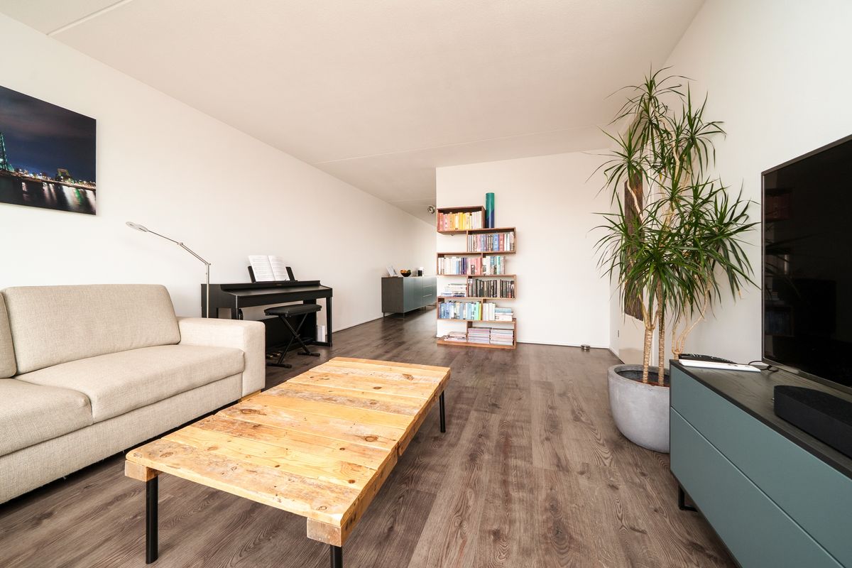 De lichte en royale woonkamer ligt aan de voorzijde van het appartement en wordt overspoeld met natuurlijk daglicht dankzij de grote raampartijen. Vanuit hier heb je een werkelijk prachtig uitzicht op Diergaarde Blijdorp, de flamingo’s zijn zelfs te zien! Een uniek en levendig uitzicht dat nooit verveelt. De woonkamer is keurig afgewerkt met gestuukte wanden en een moderne laminaatvloer en staat in open verbinding met de keuken.