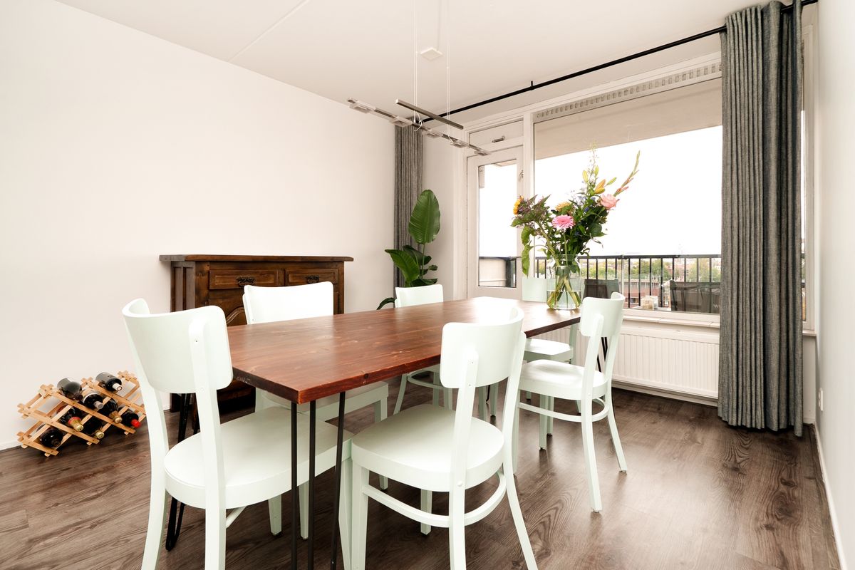Aan de achterzijde bevindt zich de eetkamer, een royale ruimte met dezelfde nette afwerking als de woonkamer. Deze kamer is eenvoudig af te sluiten en daardoor ook perfect te gebruiken als extra slaapkamer. Vanuit hier stap je direct het ruime balkon op.