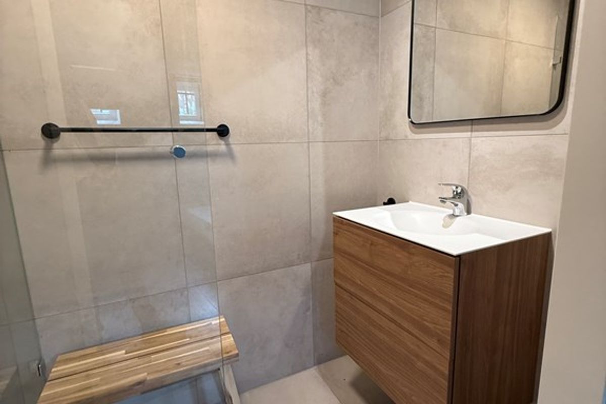 The bathroom has shower and washbasin and toilet. At the basement of the apartment is the bedroom with a double bed and a wardrobe.