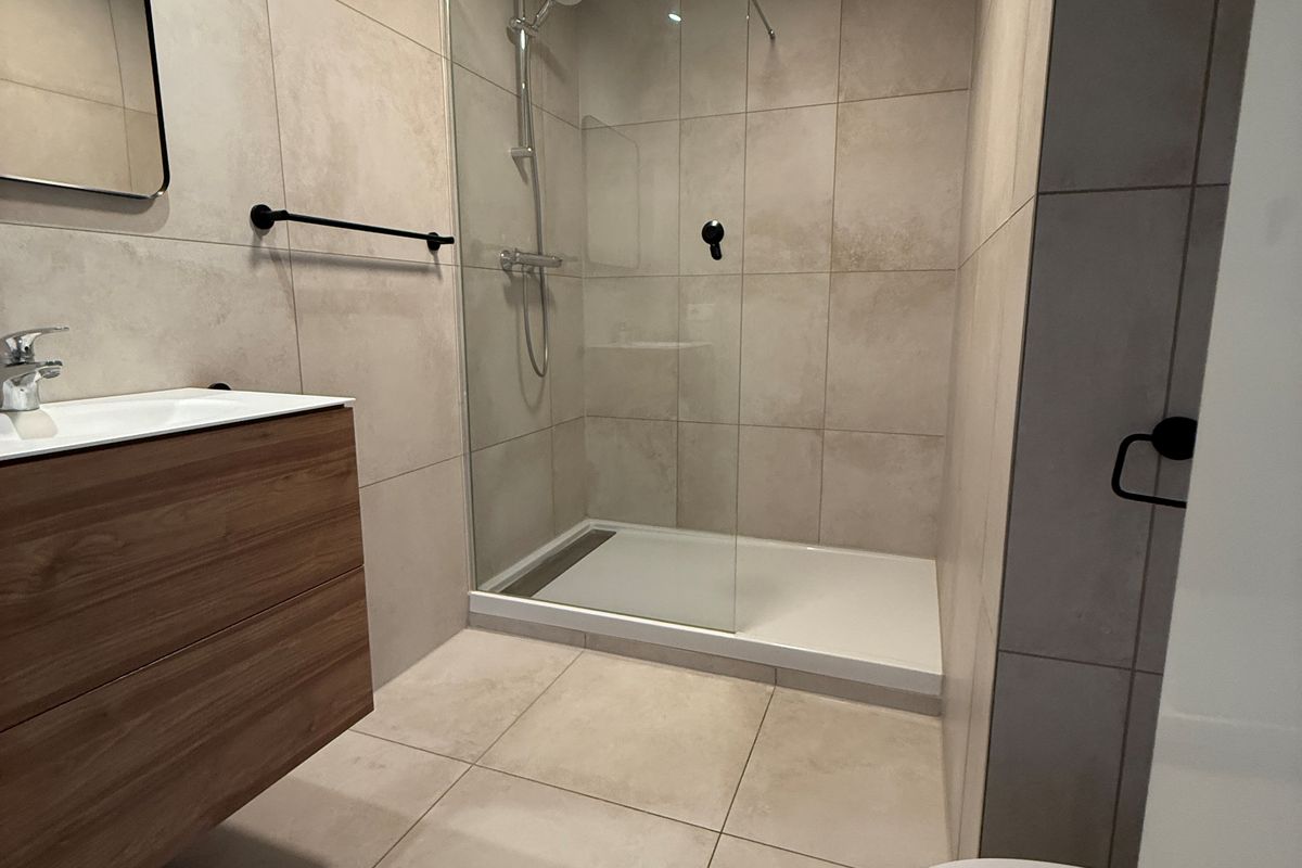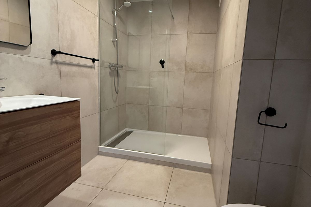 Luxury bathroom. There is a shared washing room with washers and dryers.