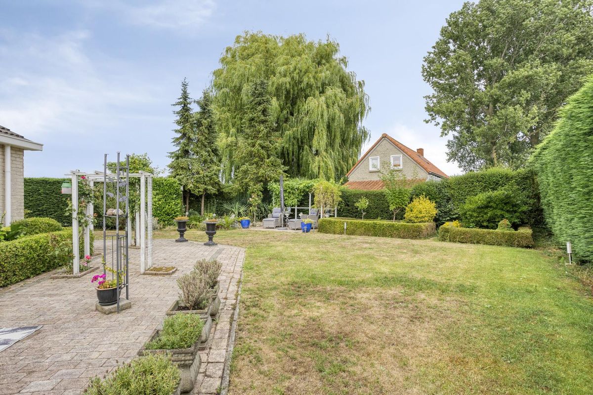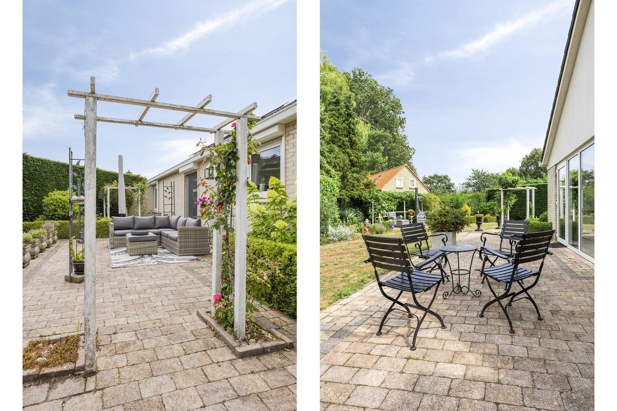 De achtertuin is een heerlijke plek om van de zon en de rust te genieten. Gelegen op het westen, met een verzorgd terras en een fraai aangelegd gazon, vormt het een fijne buitenruimte voor zowel ontspanning als gezelligheid. Een houten tuinhuis en een vrije achterom maken het geheel compleet.