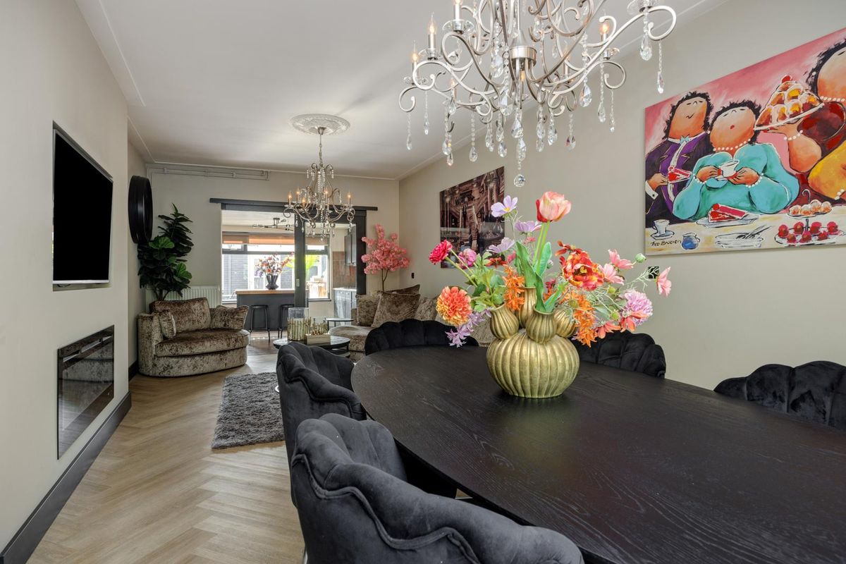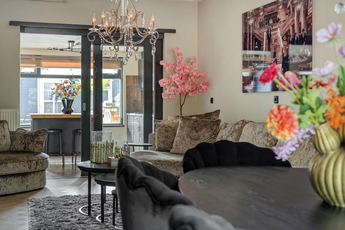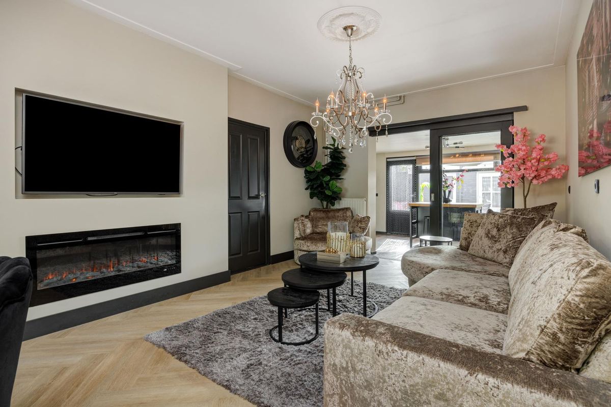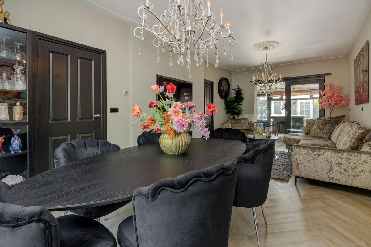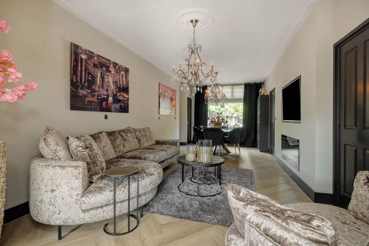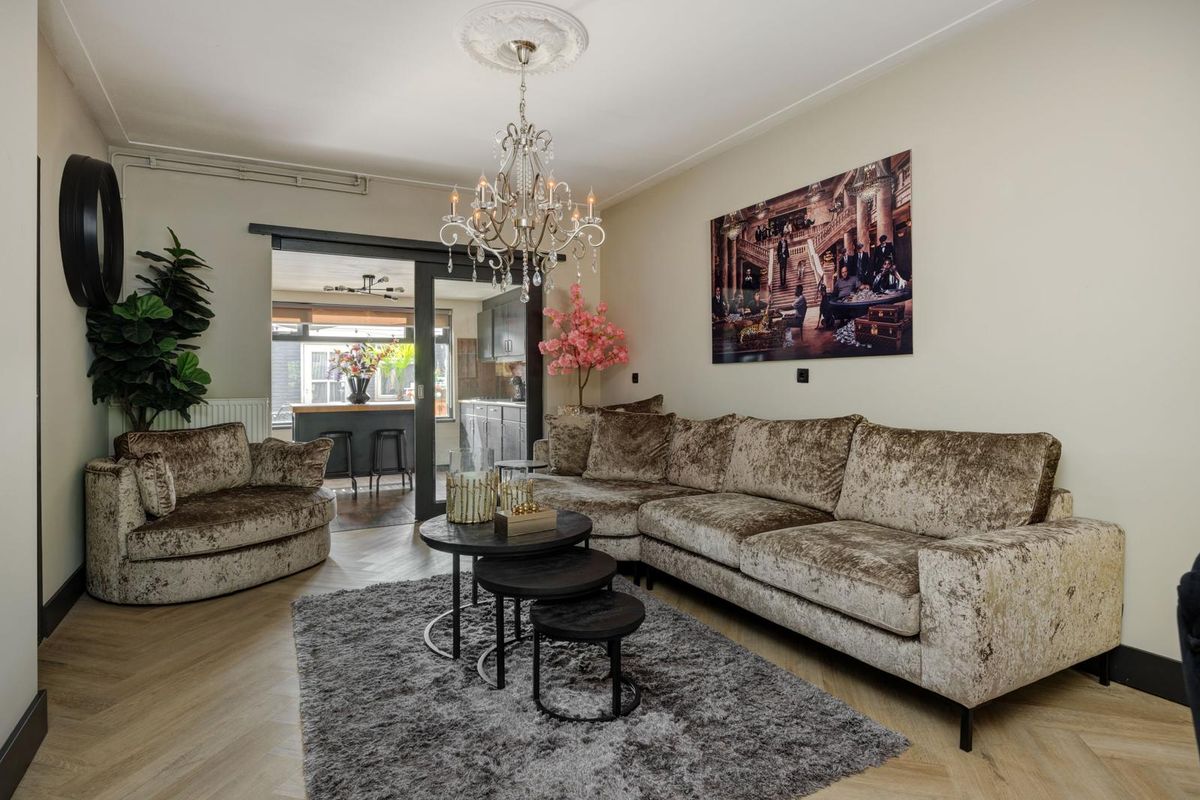 De woonkamer is strak afgewerkt met een visgraat-PVC vloer en hoge plinten. De mooie sierlijsten in de woonkamer, het glas-in-lood boven de voordeur en de Portugese tegels in de hal geven karakter aan het geheel. Dankzij de rustige basis is de ruimte eenvoudig naar eigen smaak in te richten.