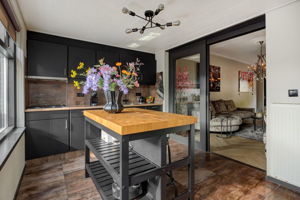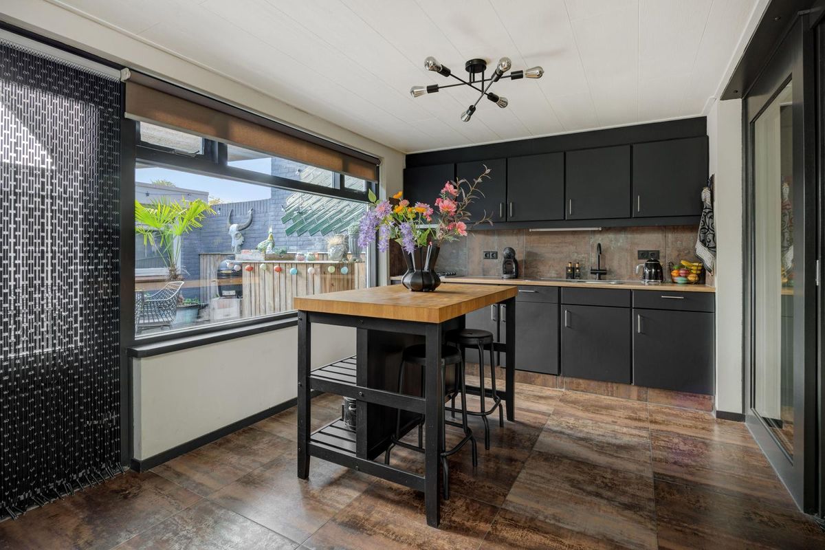 De uitgebouwde keuken is verrassend ruim en licht en vormt een prettige plek om samen te koken. Twee jaar geleden is het platte dak van de uitbouw vernieuwd en geïsoleerd, dus daar hoef je voorlopig niet meer naar om te kijken.