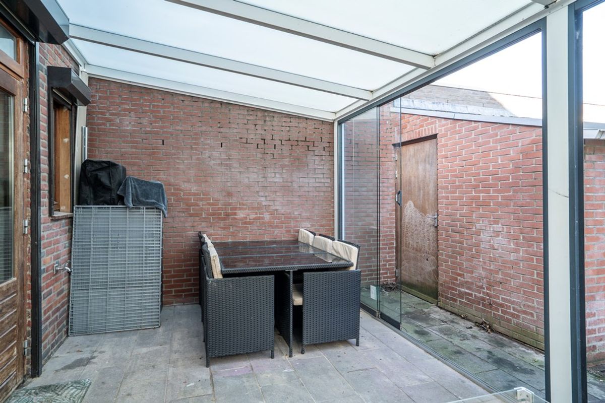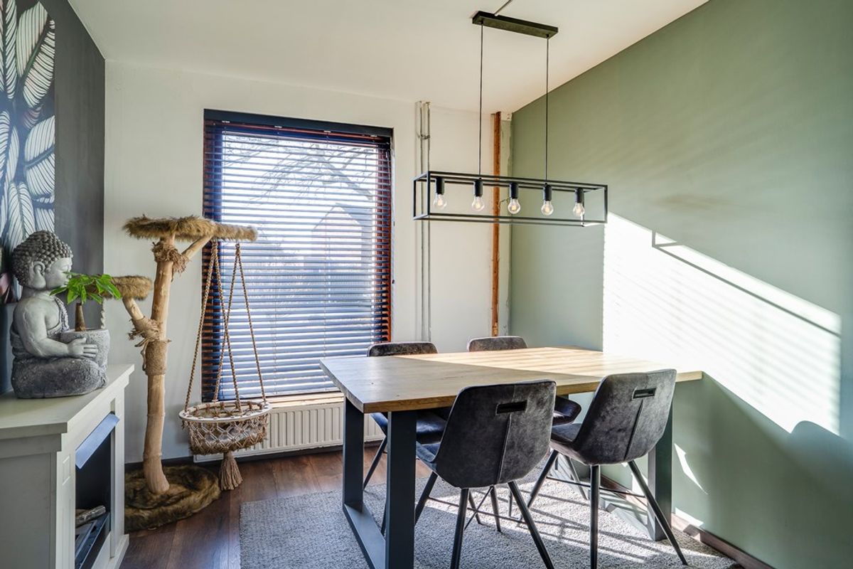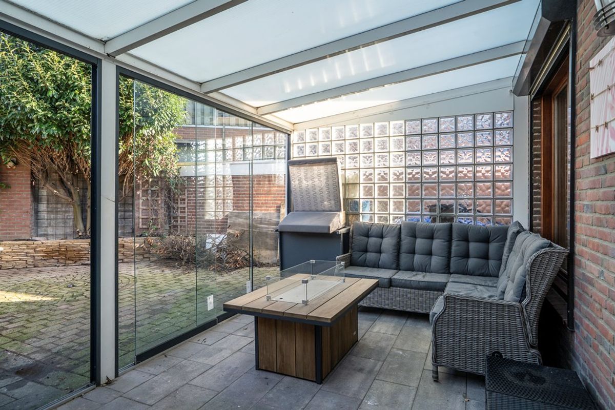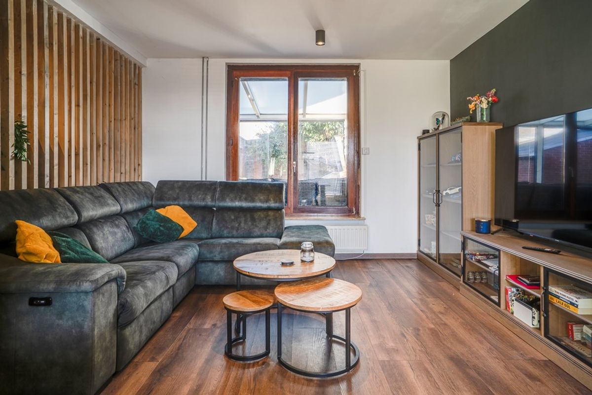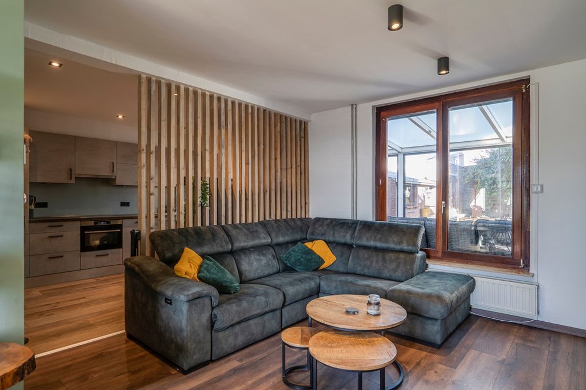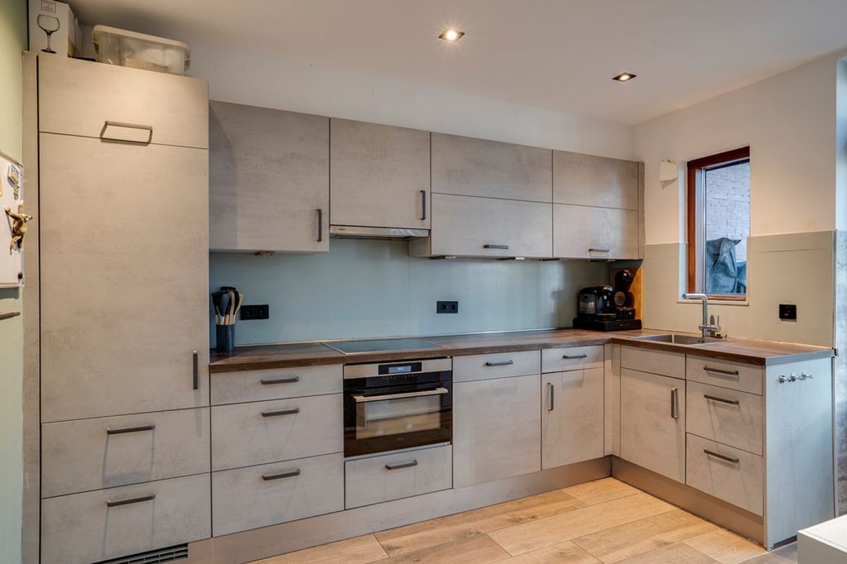 De open keuken is uitgerust met inbouwapparatuur, waaronder een vaatwasser, koelkast en afzuigkap, en staat in directe verbinding met de lichte doorzonwoonkamer. Vanuit de keuken stap je zo de tuin in via een deur naar de overkapping met glazen schuifpuien — ideaal om het hele jaar door van buiten te genieten.