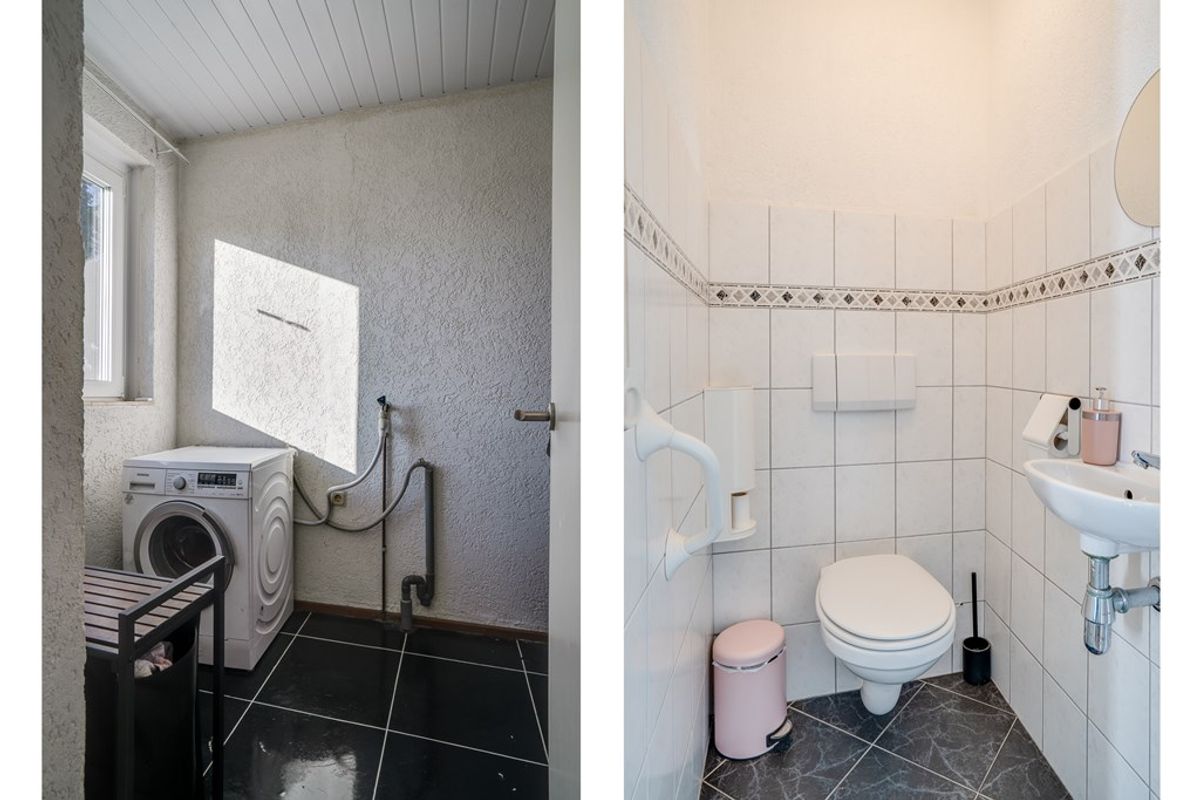 Via de voordeur kom je binnen in de hal, die toegang biedt tot een handige wasruimte, een modern toilet met zwevend toilet en fonteintje, de meterkast en een praktische provisiekelder voor extra opslag. Vanuit de hal bereik je ook de trap naar de eerste verdieping en de woonkamer met open keuken.