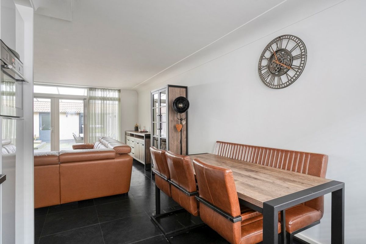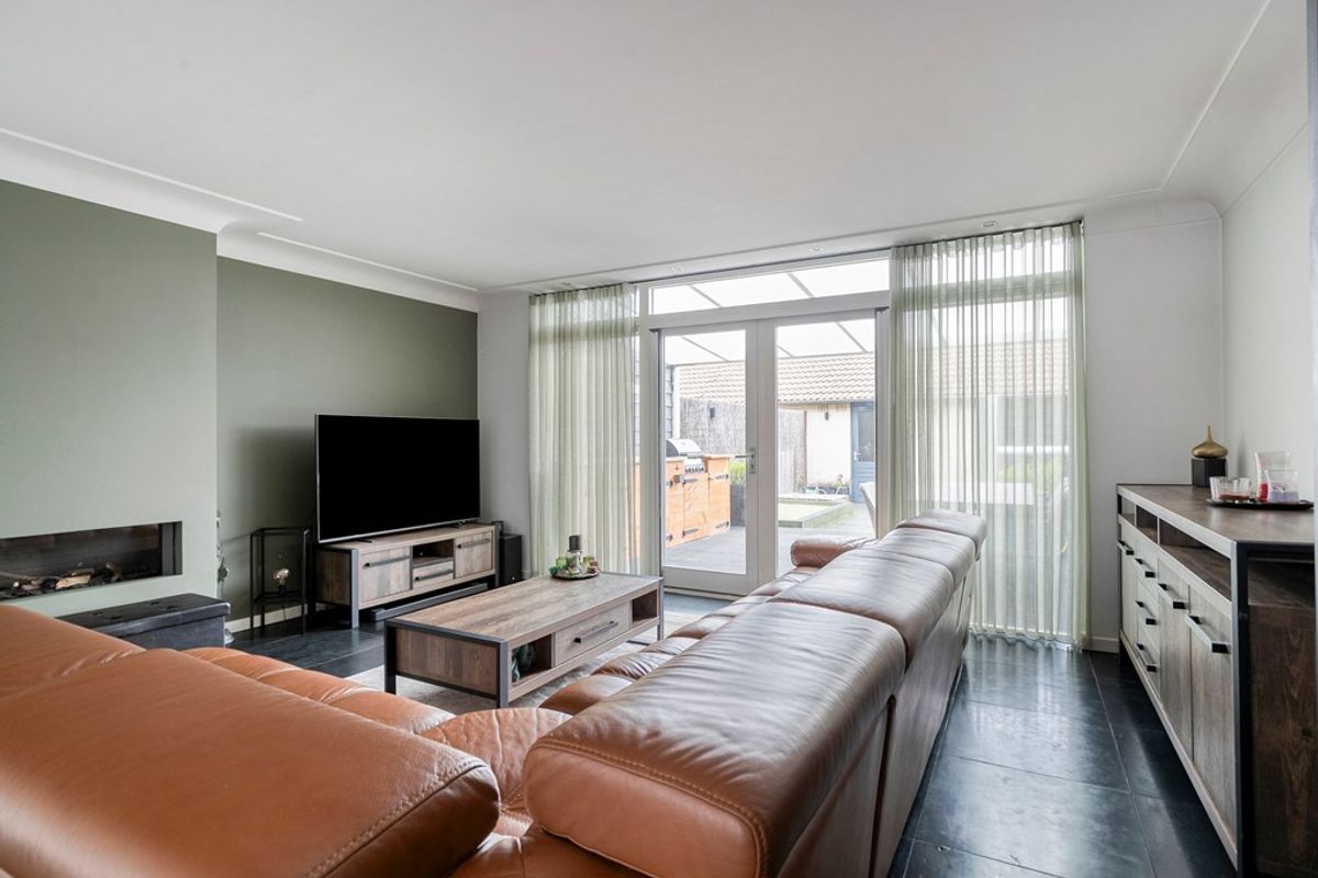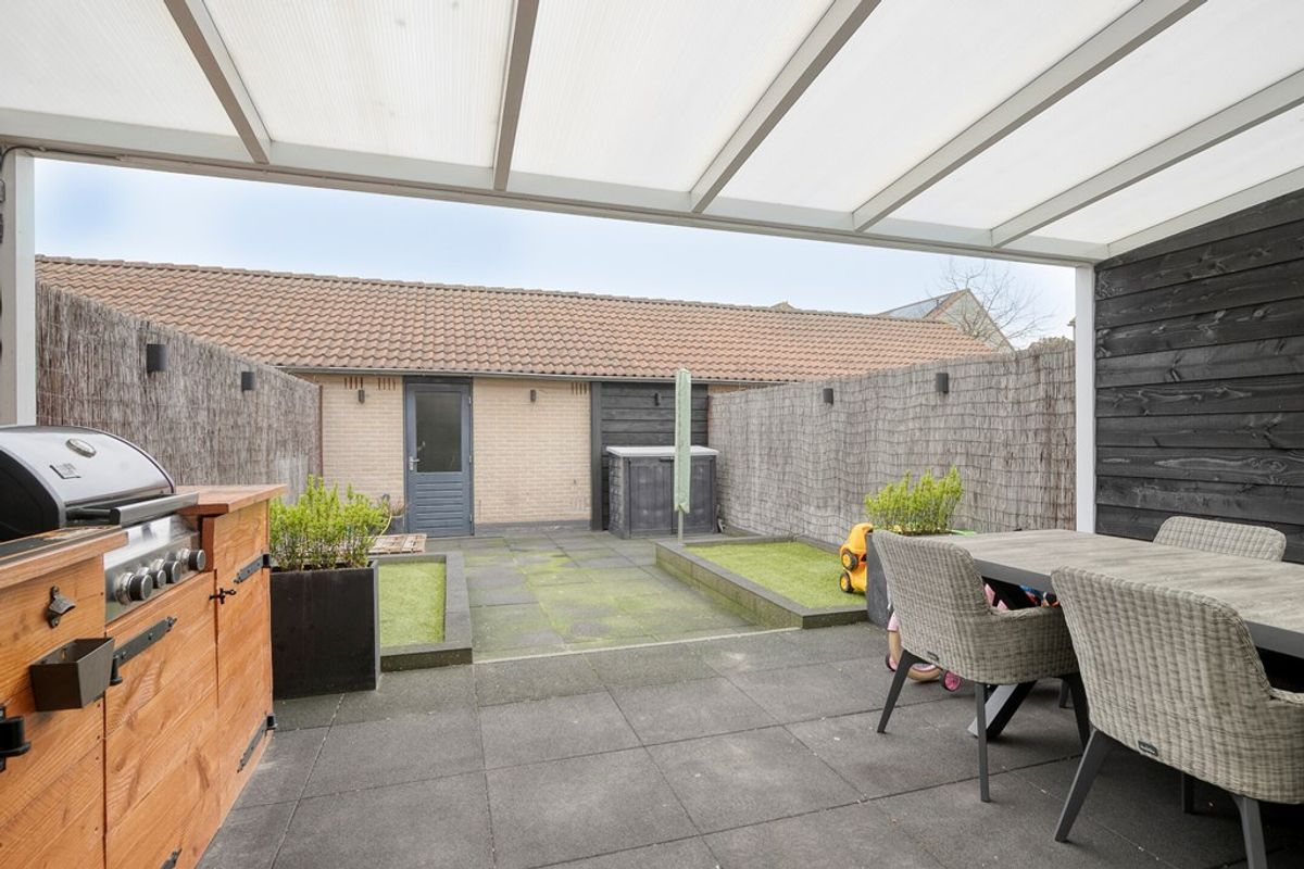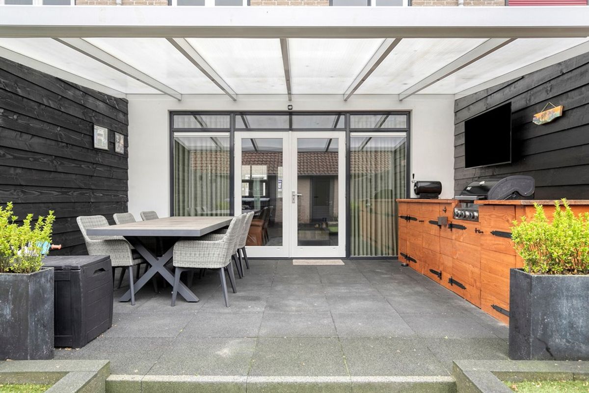 Via dubbele tuindeuren loop je zó de onderhoudsvriendelijke achtertuin in. Dé plek om te barbecueën, relaxen of lang na te tafelen onder de nieuwe, luxe veranda. Buiten wordt het woongenot hier echt verlengd!