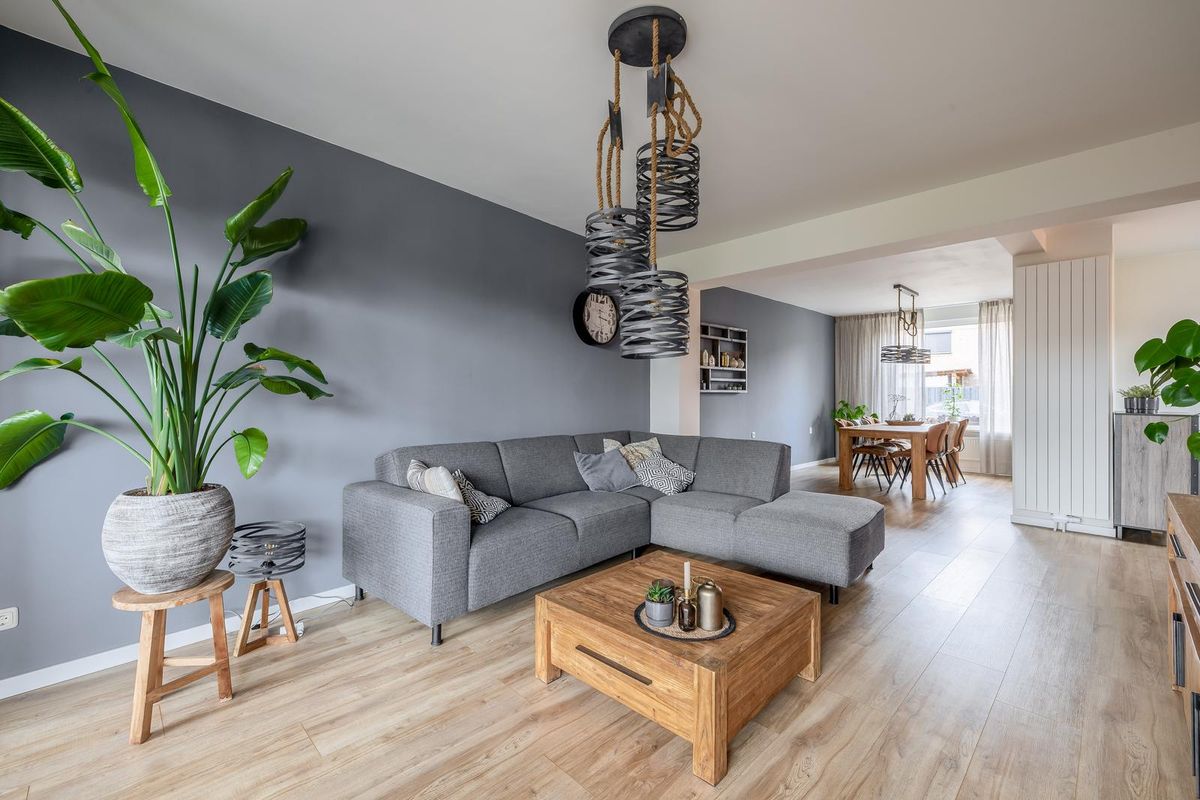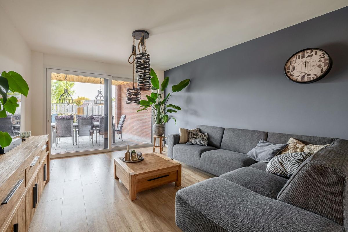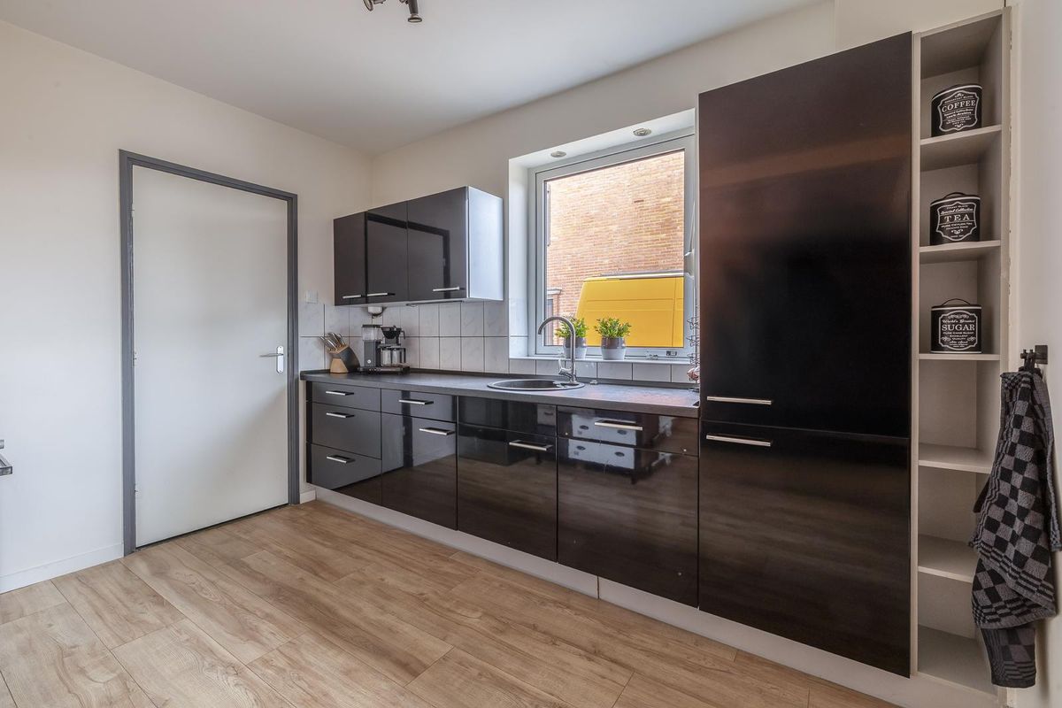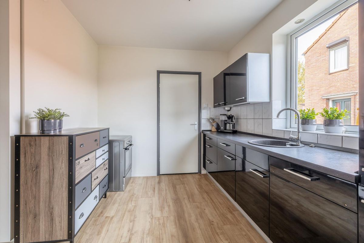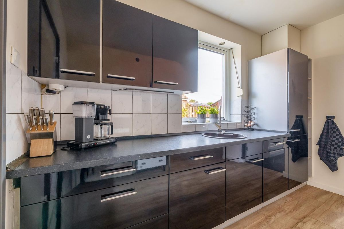 De keuken staat in open verbinding met de uitgebouwde woonkamer. Hier ligt een laminaatvloer. Dankzij de grote schuifpui (met hor) aan de achterzijde geniet je hier van veel lichtinval en directe toegang tot de tuin. De aanbouw is voorzien van vloerverwarming.