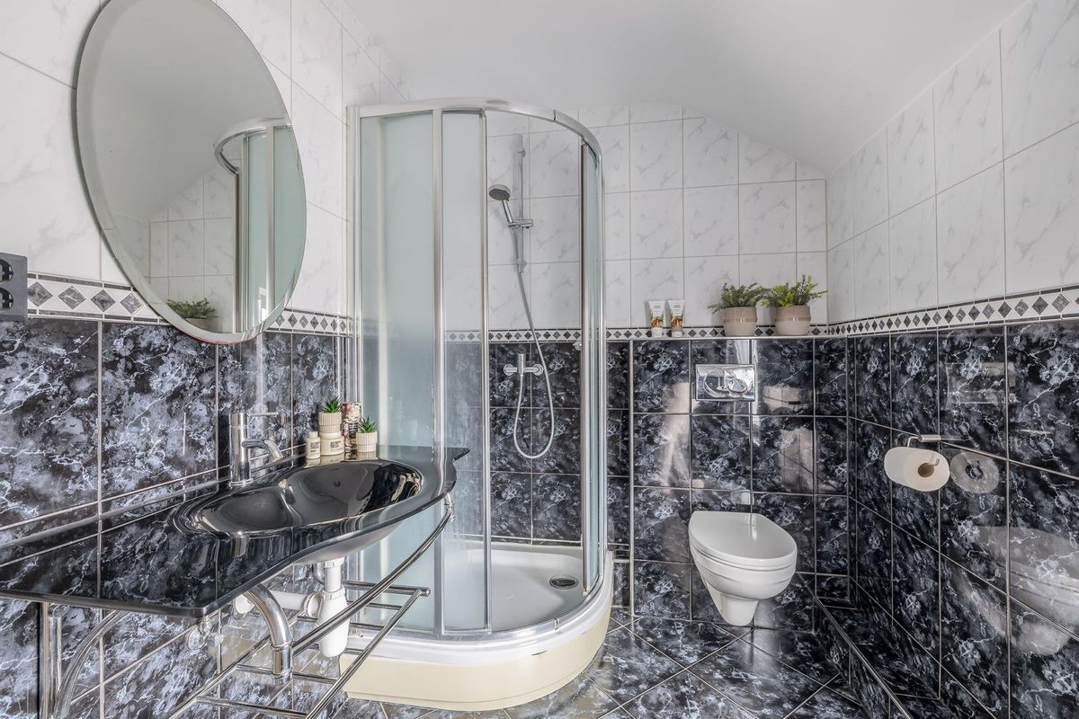De volledig betegelde badkamer beschikt over een vaste wastafel, douchecabine, toilet en een designradiator. Het raam zorgt voor voldoende daglicht.