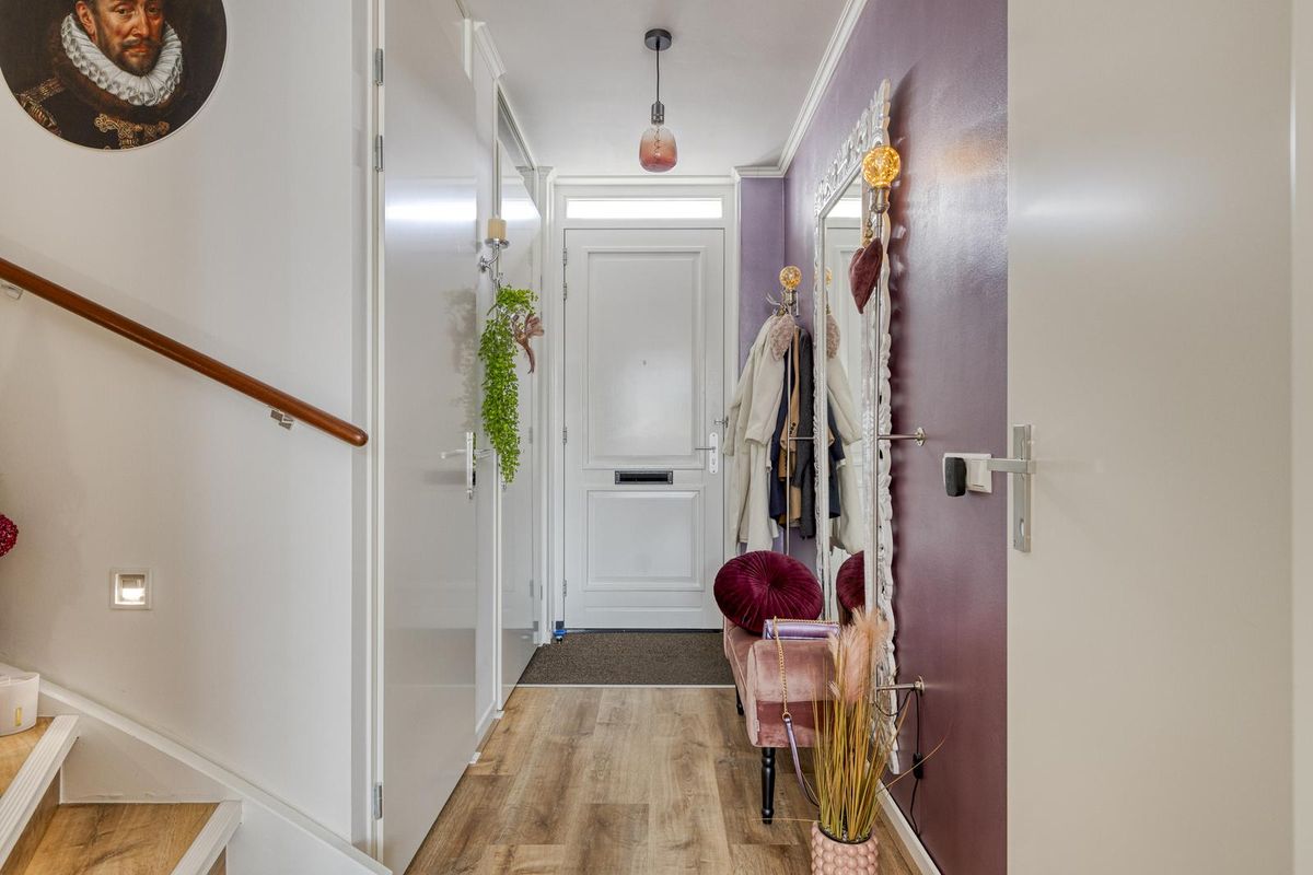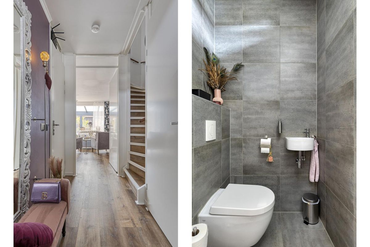 Entree/hal met de meterkast, vaste kast met de opstelling van de warmtepomp, de trapopgang en het moderne toilet met fonteintje.
