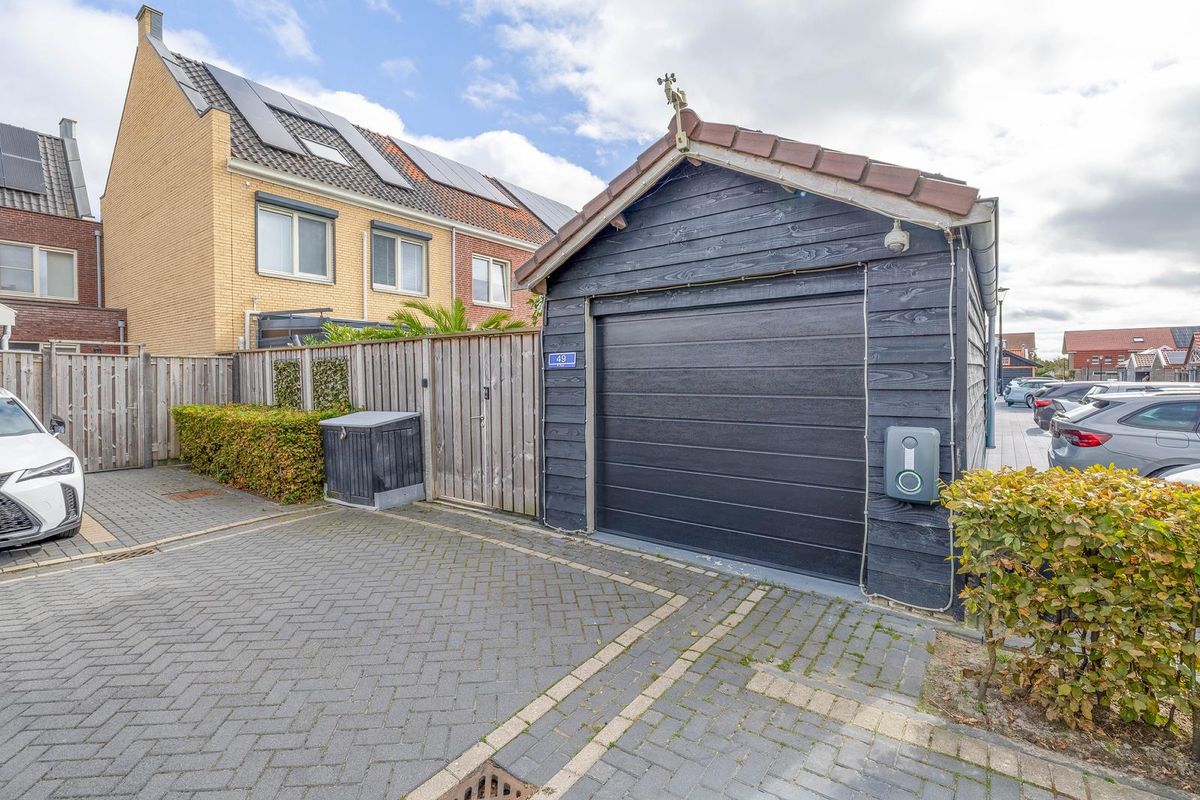 De achtertuin ligt op het westen en is onderhoudsvriendelijk aangelegd. Er is toegang tot de geïsoleerde garage. Deze garage beschikt over een elektrische segmentdeur, wastafel, boiler en een bergzolder. Aan de buitenzijde van de garage vindt u de laadpaal om elektrisch te kunnen laden.