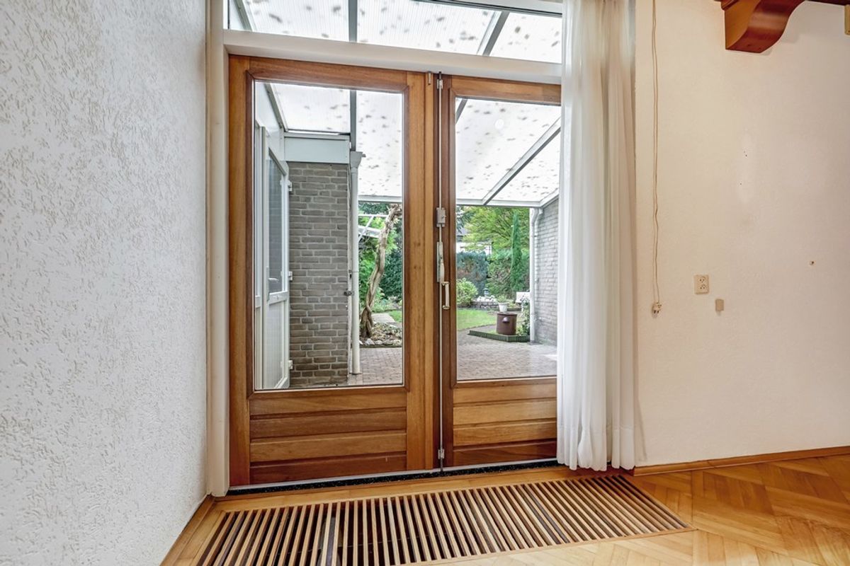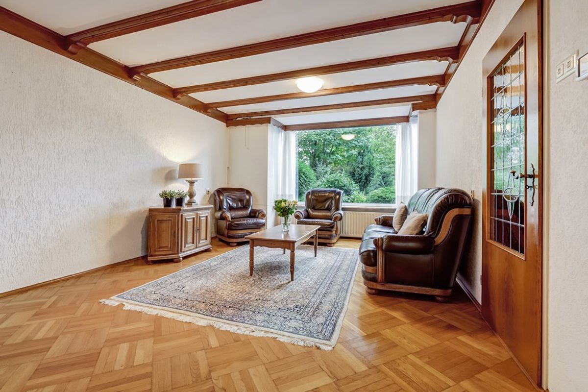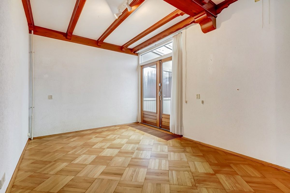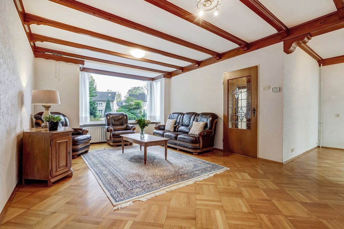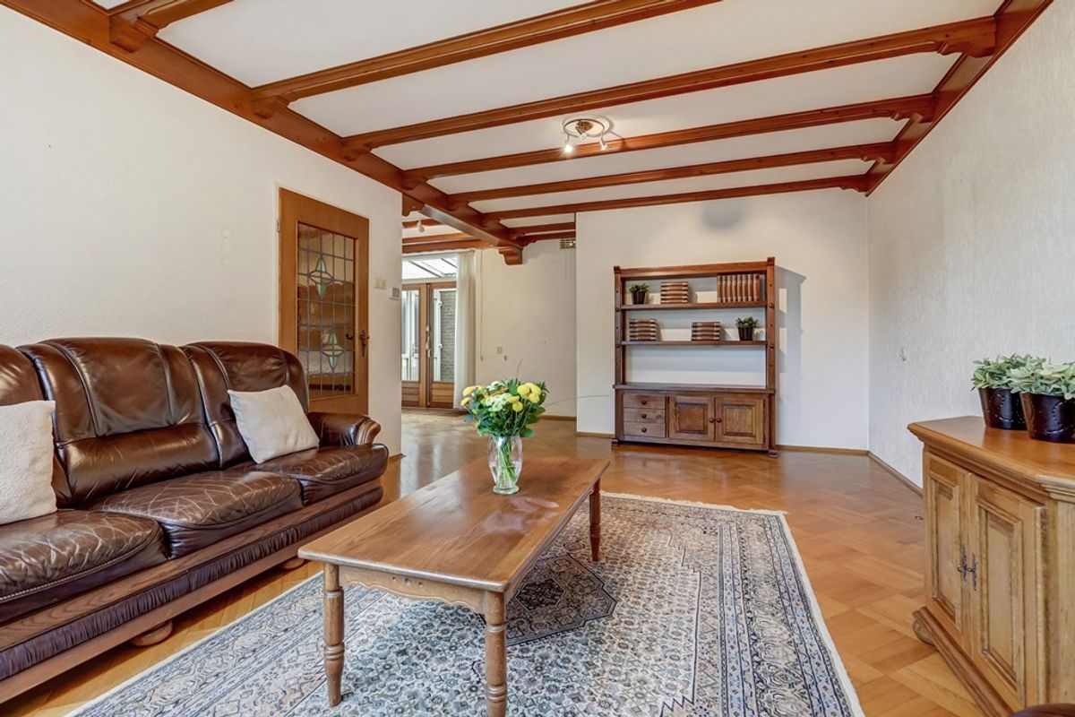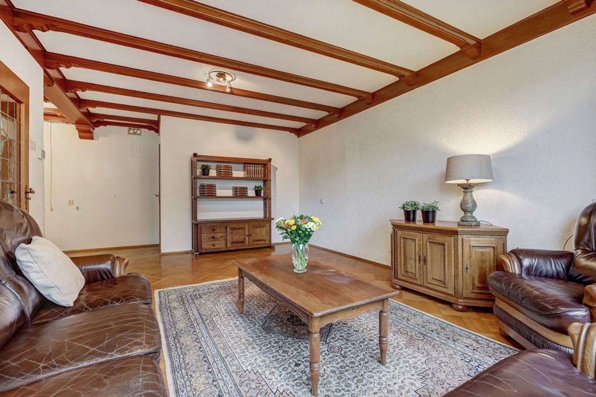De sfeervolle woonkamer bereik je via een karakteristieke deur met glas-in-loodramen. De royale erker aan de voorzijde en de openslaande deuren aan de achterzijde zorgen voor veel lichtinval en een fijn uitzicht op het groen rondom de woning. Dankzij de combinatie van de fraaie houten vloer en de zichtbare balken bij het plafond ademt deze ruimte warmte, gezelligheid en een vleugje nostalgie.
