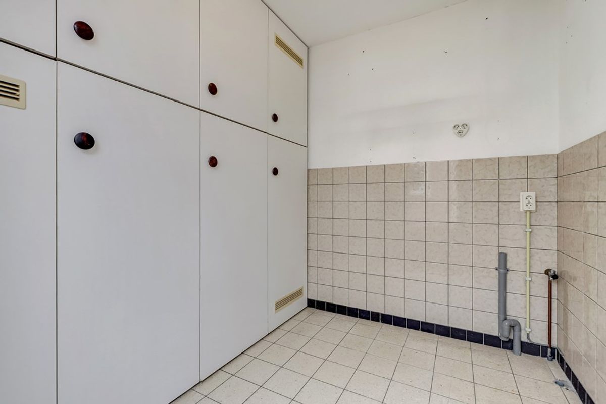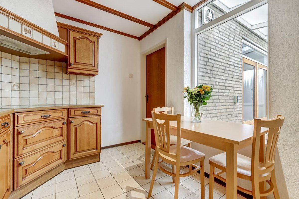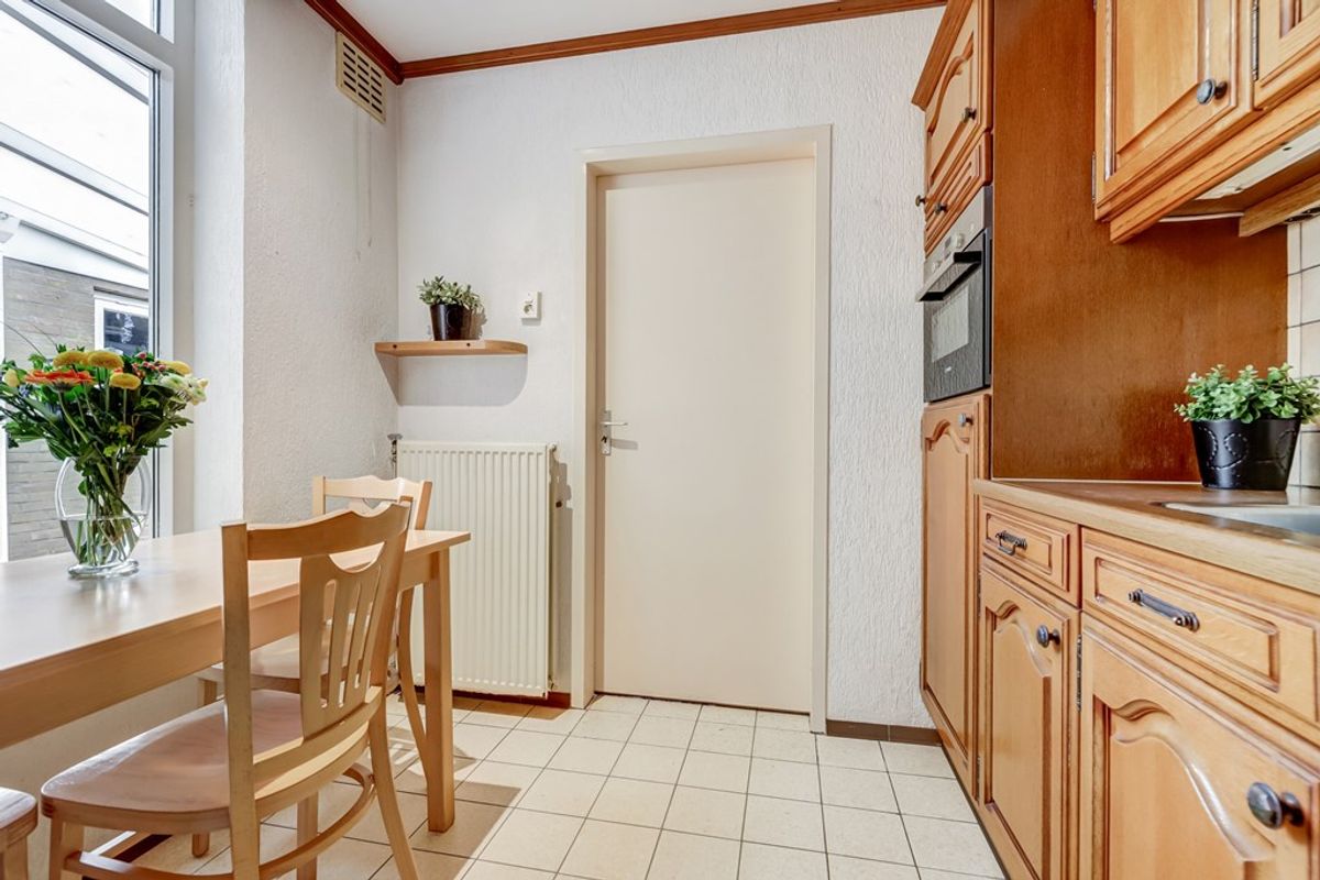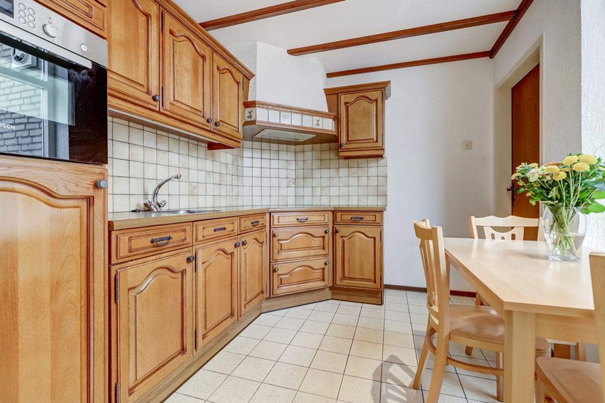 De keuken ligt in de aanbouw en is gescheiden van de woonkamer, waardoor er een rustige kookruimte ontstaat. Deze is uitgevoerd met een vierpits inductiefornuis, combi-oven, koelkast en een klein model vaatwasser. De keuken is van degelijk eikenhout met volop bergruimte: praktisch in gebruik, maar ook een mooie basis om naar eigen smaak te moderniseren. Aansluitend ligt de bijkeuken, voorzien van een grote inbouwkast met veel opbergmogelijkheden en de witgoedaansluitingen. Via de bijkeuken heb je toegang tot de tuin. Zowel de keuken als de bijkeuken zijn voorzien van een onderhoudsvriendelijke tegelvloer.