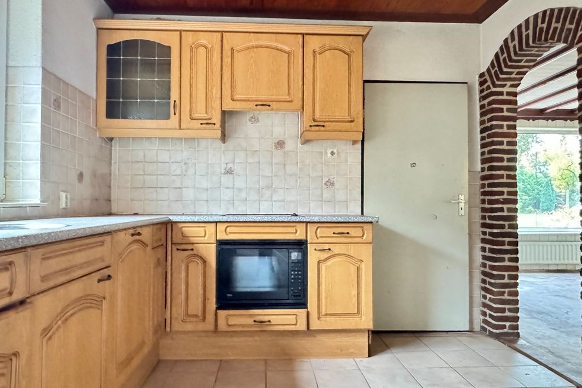 - Half-open keuken met hoekopgestelde eiken inrichting.