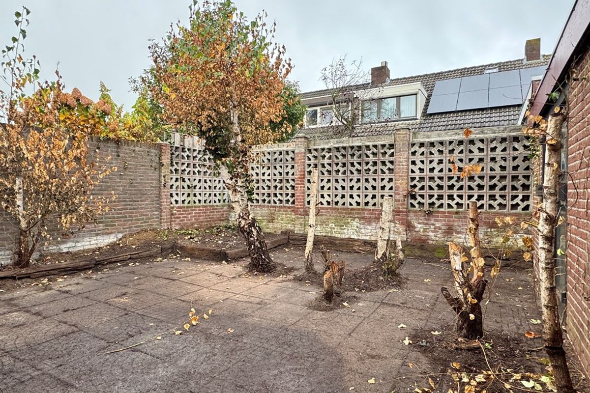 Grotendeels betegelde achtertuin met eigen achterom. Ruime garage (ca. 3.67 x 6.53m) met oprit geschikt voor meerdere auto's.