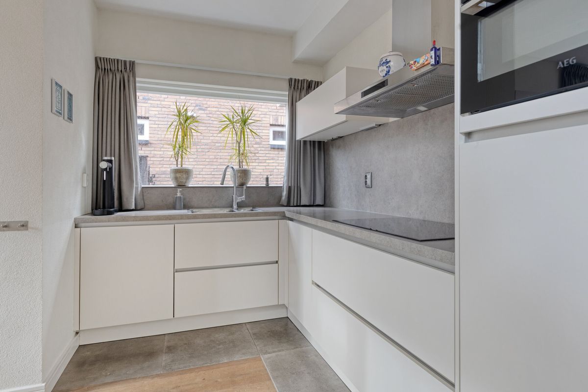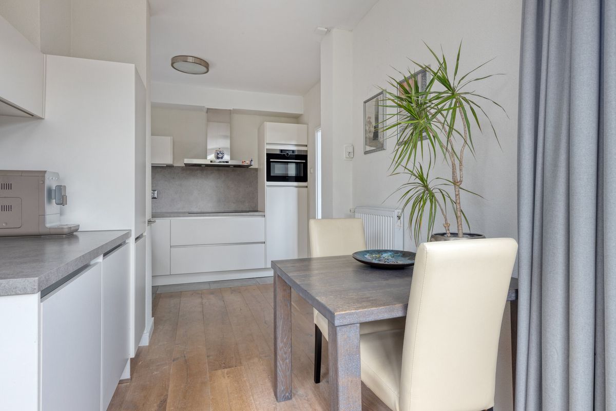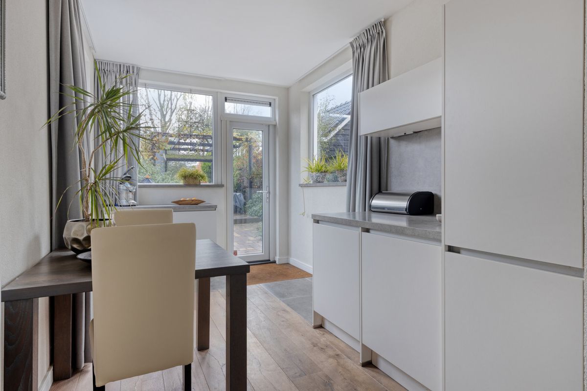 Keuken, een royaal uitgebouwde eetkeuken, voorzien van een inductiekookplaat met rvs afzuigkap, koelkast met een vriesvak, combioven, vaatwasser, wasmachine- en drogeraansluiting en veel kastruimte. Verder is de keuken voorzien van een betonvloer en kunststof kozijnen en biedt het toegang tot de achtertuin.