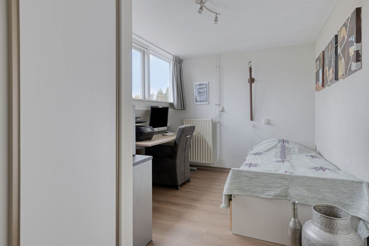 Slaapkamer 2, gelegen aan de achterzijde in de uitbouw en bereikbaar via slaapkamer 1, voorzien van een kunststof kozijn met een draai/kantelraam en een elektrisch rolluik
