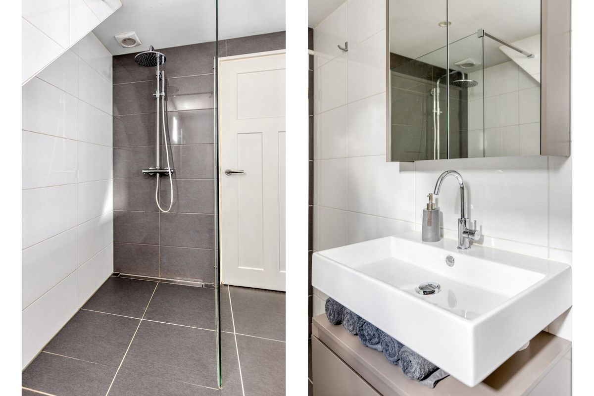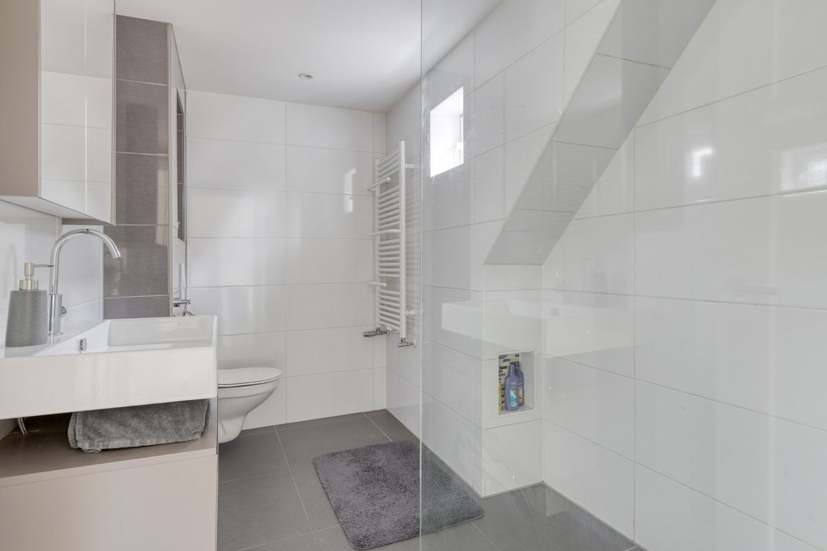 Badkamer, een moderne en geheel betegelde badkamer, voorzien van een inloopdouche met thermostaatkraan, rainshower en handdouche, een tweede toilet (hangend closet), wastafel met onderlade en spiegelkast, badkamerradiator, elektrische afzuiging en een klein kunststof raam.