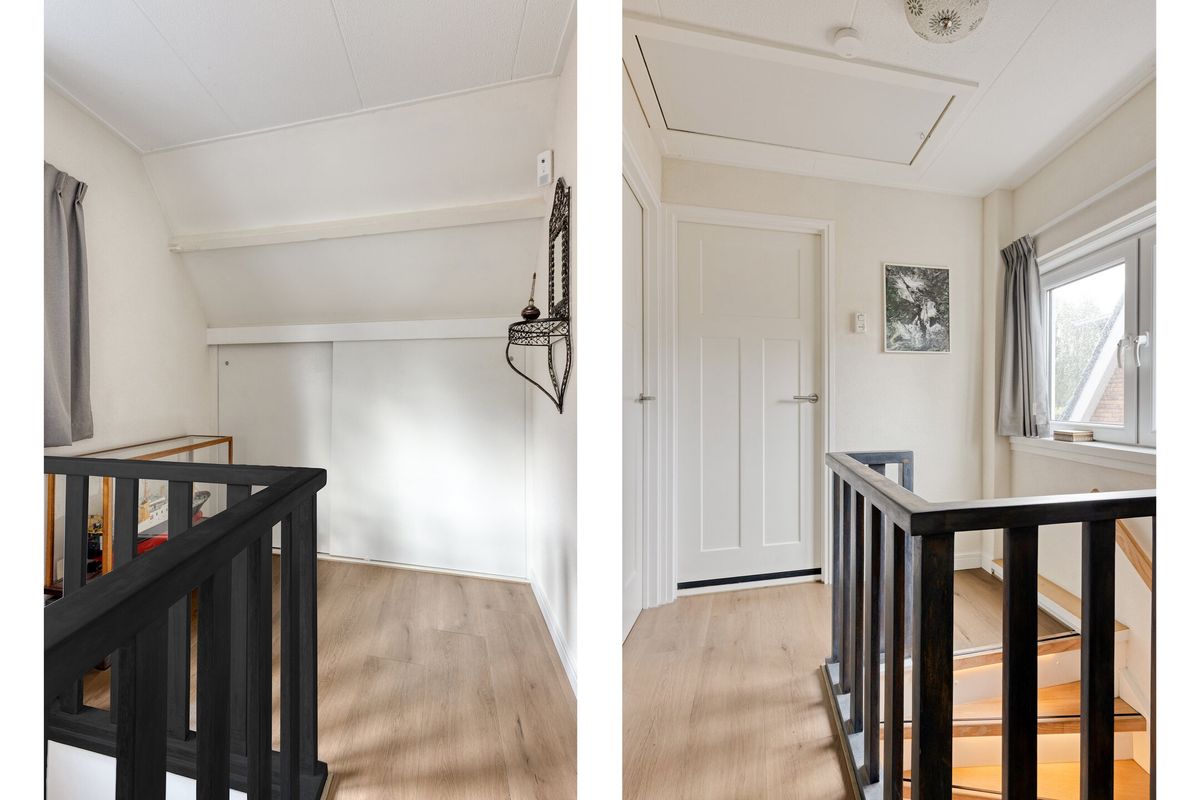 Overloop, met toegang tot 2 slaapkamers, badkamer, bergruimte achter het knieschot en de bergzolder via een vlizo trap. Het kozijn in de zijgevel zijn is kunststof.