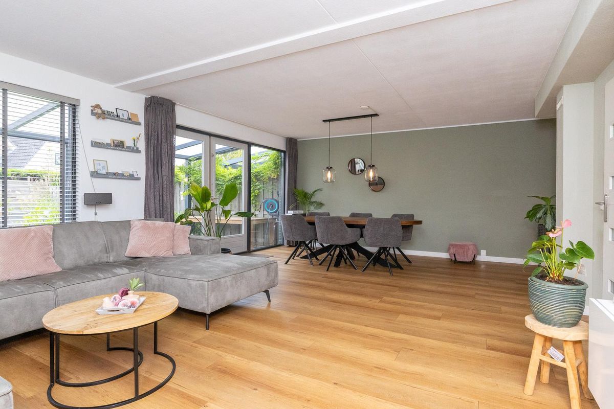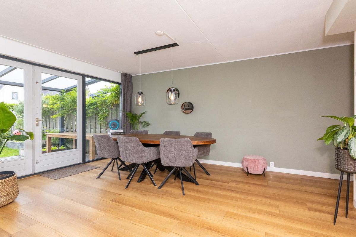 Entree, hal met PVC vloer en vernieuwde meterkast. De PVC vloer loopt door in de keuken en eetkamer. De ruime, lichte woonkamer is extra breed, voorzien van grote raampartijen en dubbel openslaande deuren naar de zonnige tuin.