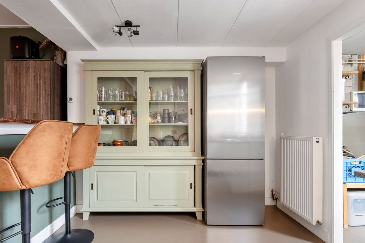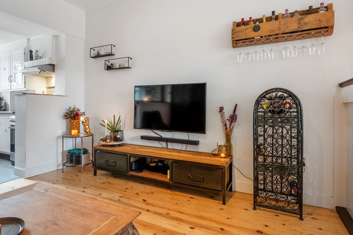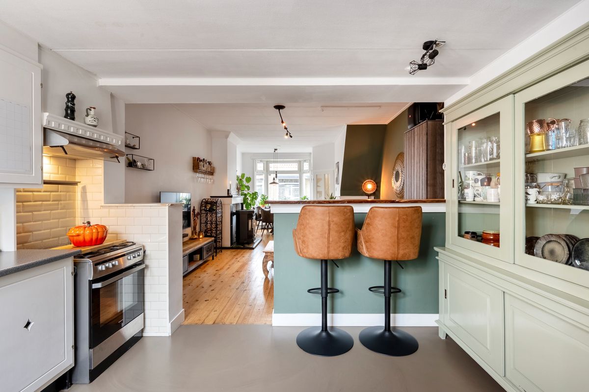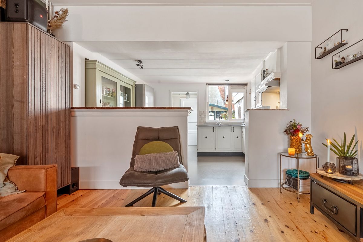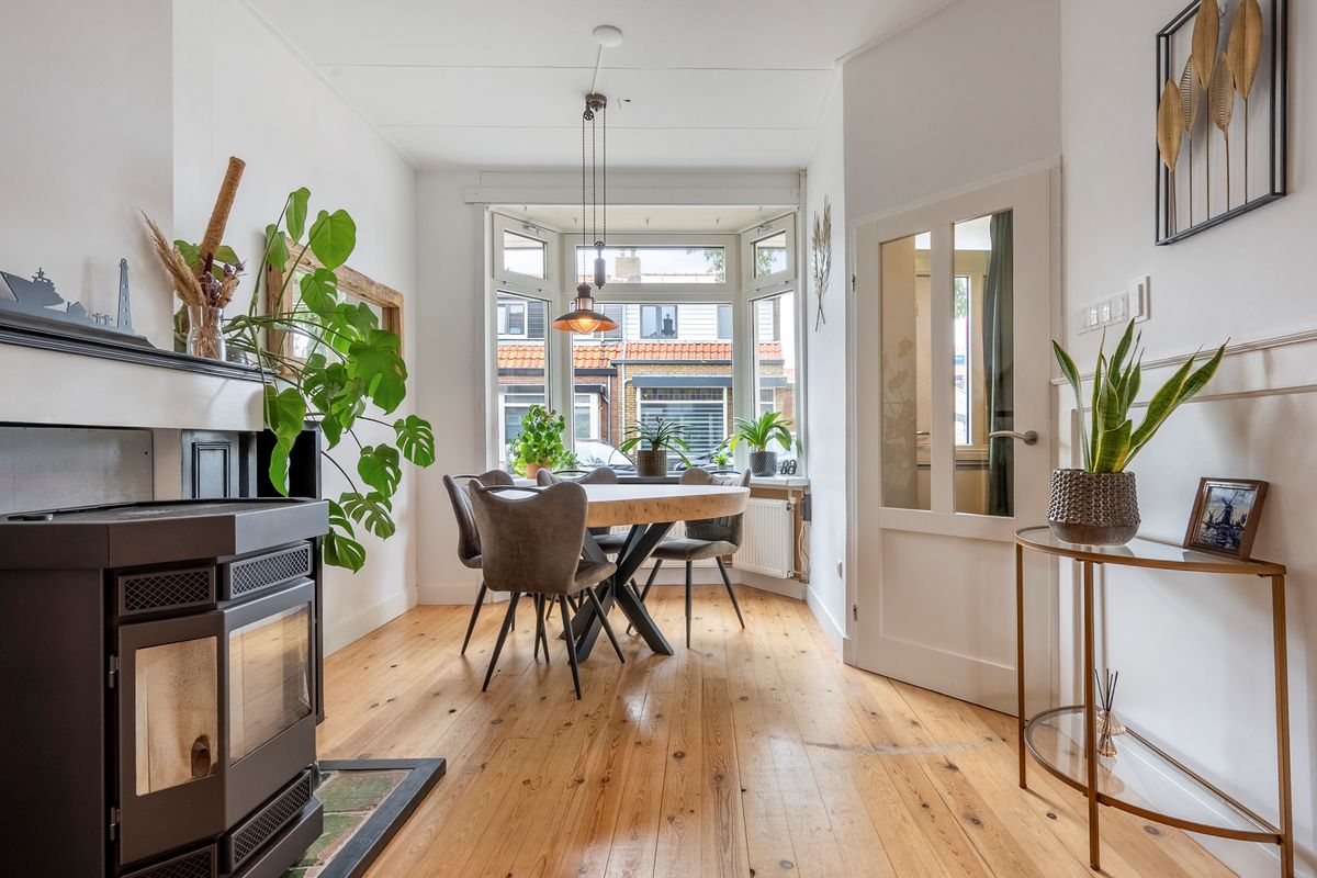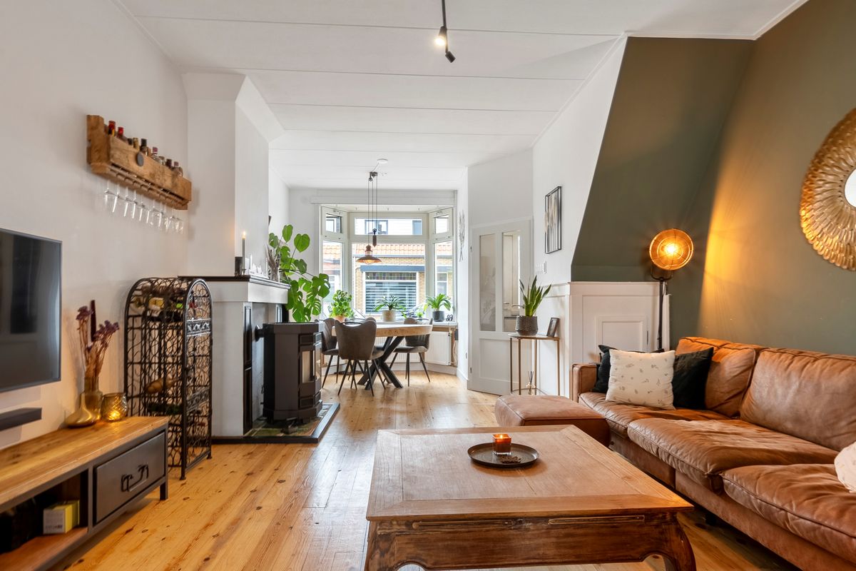 De woning is aan de achterkant uitgebouwd en combineert op prettige wijze authentieke elementen met hedendaags wooncomfort. Zo is er een ruime woonkamer met hoog plafond, een karakteristieke erker, een rustieke houten vloer op beton, en een schouw met daarvoor een jonge pelletkachel (2023) – eenvoudig te bedienen, duurzaam en sfeervol.