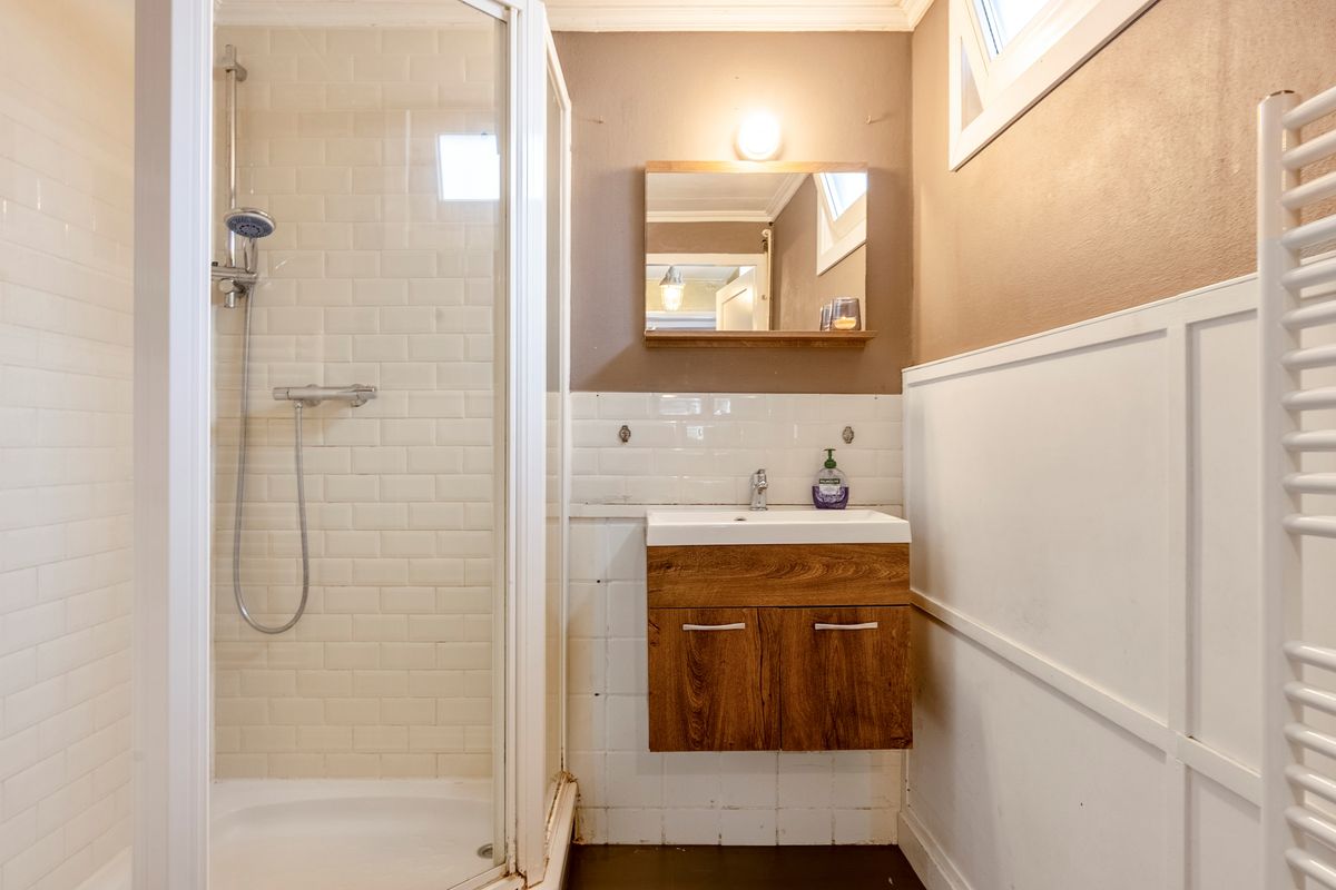 Na de bijkeuken volgt de badkamer, ingericht met een afsluitbare douche, wastafelmeubel, planchet-spiegelcombinatie, designradiator, toilet en een raam voor daglicht en natuurlijke ventilatie.