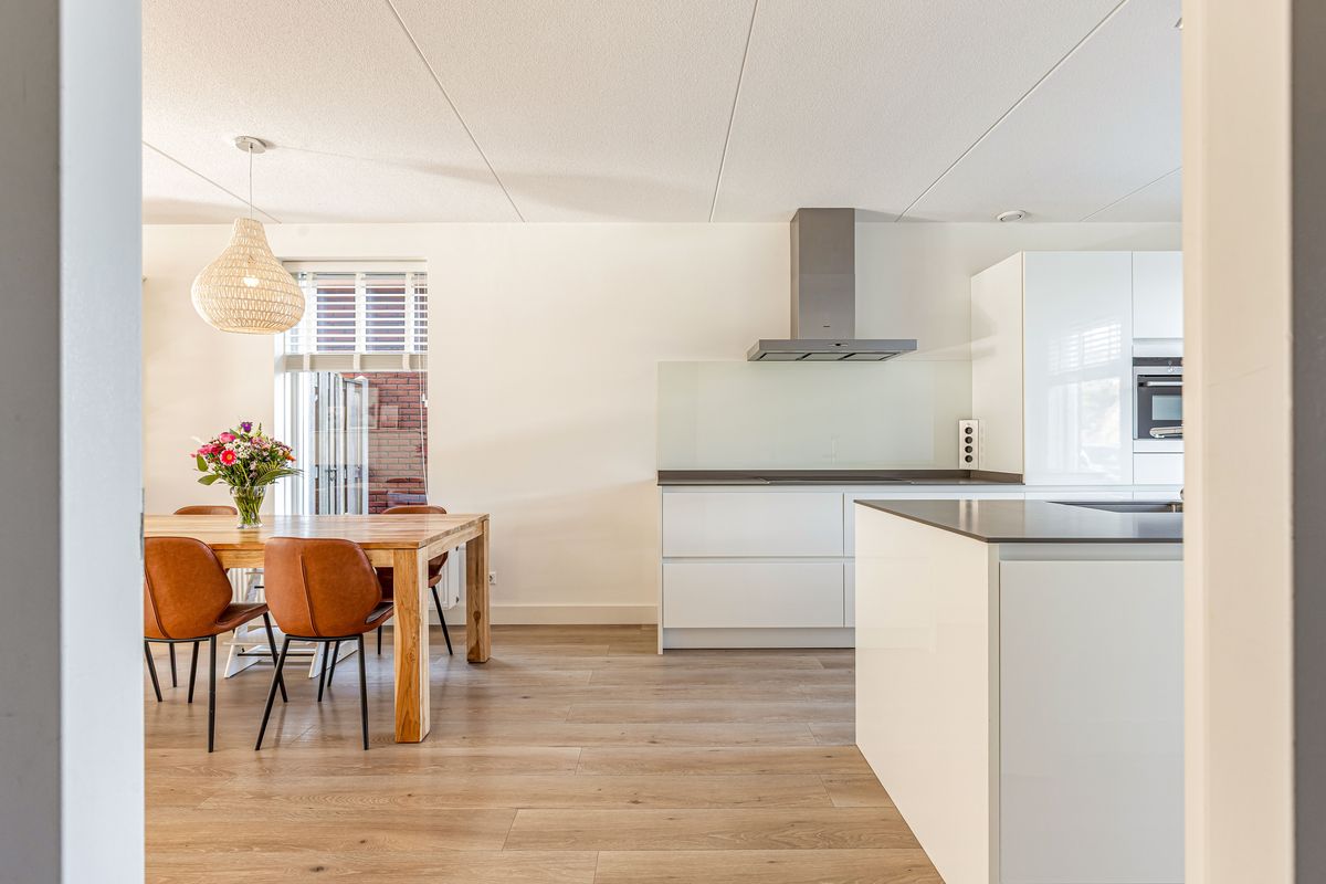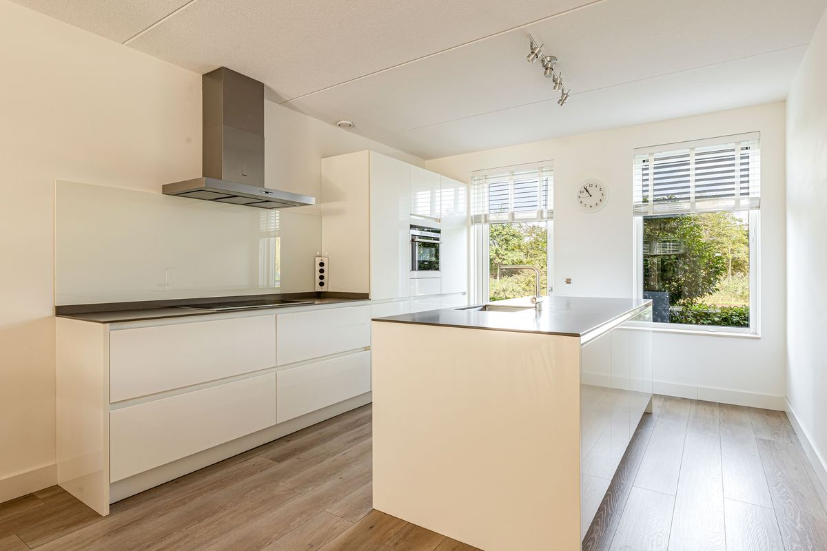 De moderne keuken is van alle gemakken voorzien en staat in directe verbinding met de woonkamer. Het gebruik van hoogwaardige materialen en de strakke afwerking geven de keuken een eigentijdse uitstraling en maken dat de keuken een heerlijke plek is om te kokkerellen terwijl u geniet van een prachtig uitzicht op de tuin. De keuken is van diverse inbouwapparatuur voorzien, te weten: koel-/vriescombinatie, vaatwasser, combimagnetron, inductiekookplaat en afzuigkap (voert af naar buiten).