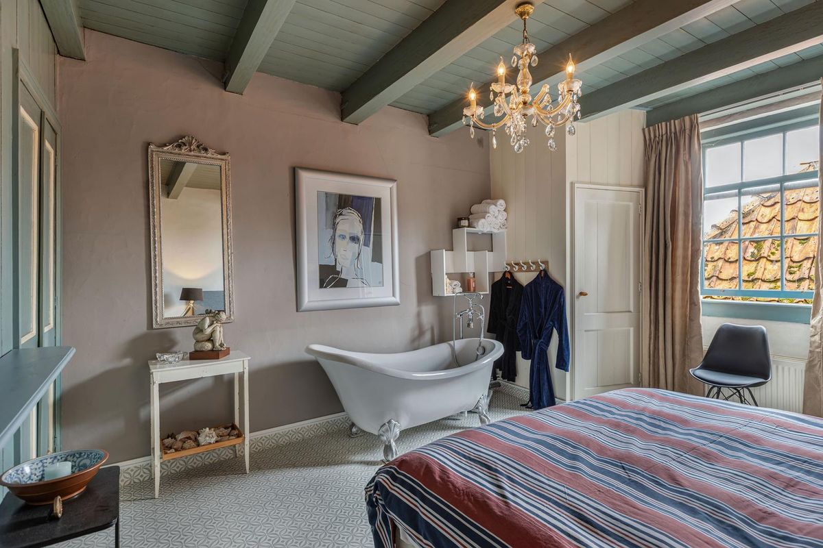 Aan de achterzijde van de woning bevindt zich de master bedroom met een prachtig balkenplafond en een badkamer ensuite met vrijstaand bad, toiletvoorziening en ingebouwde kast.
