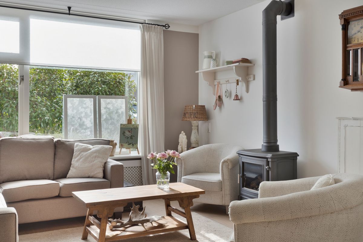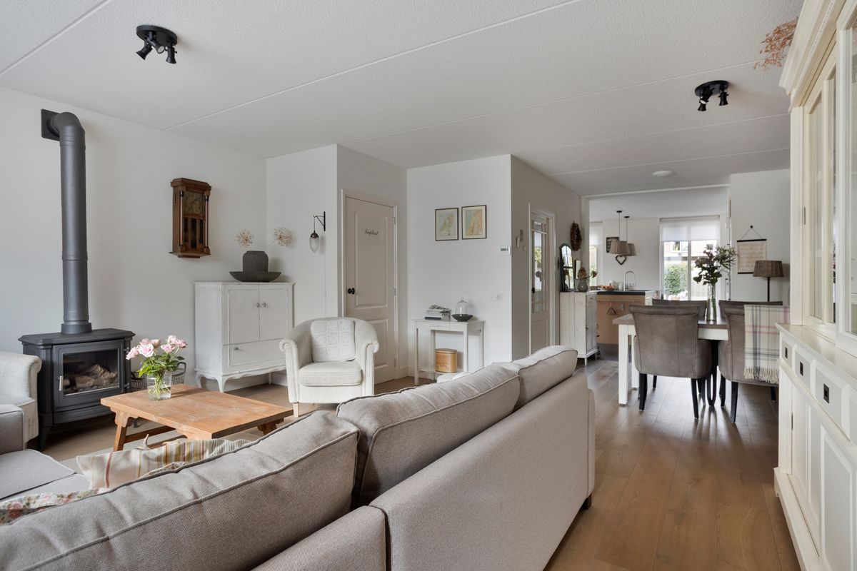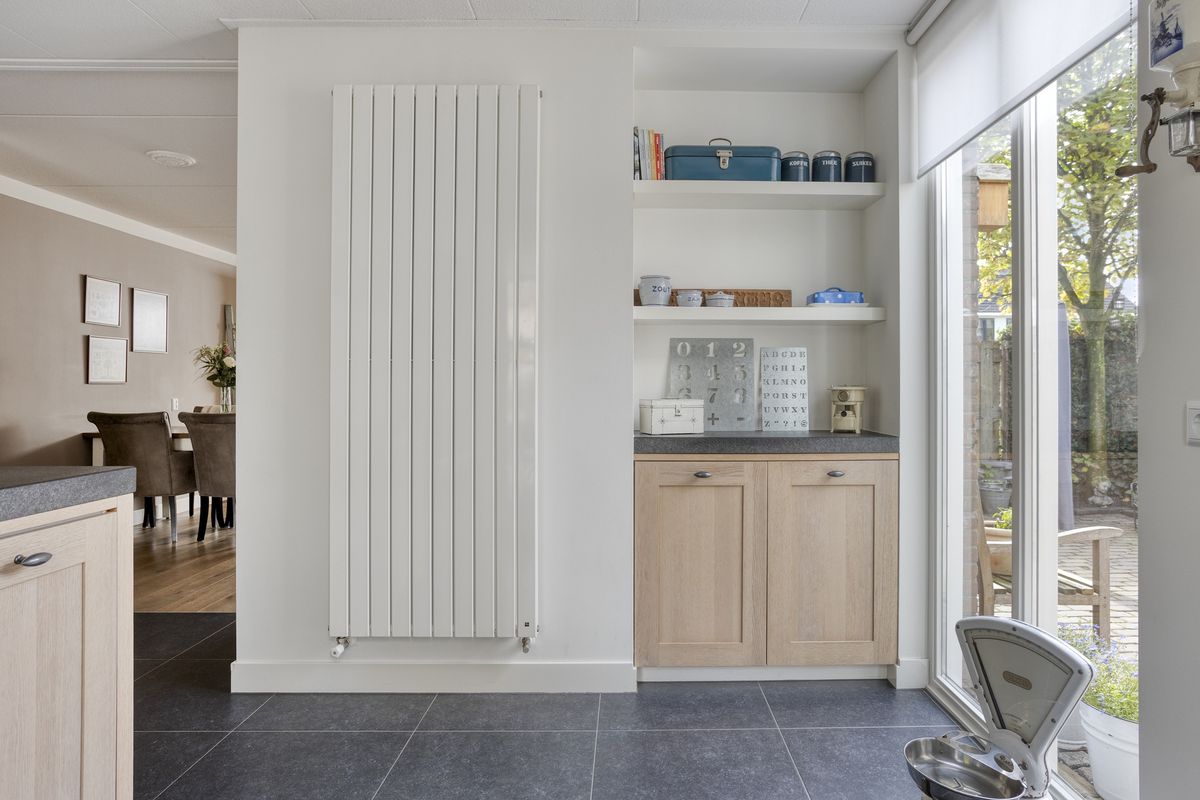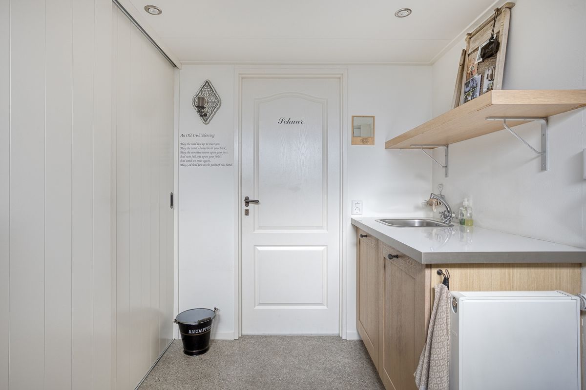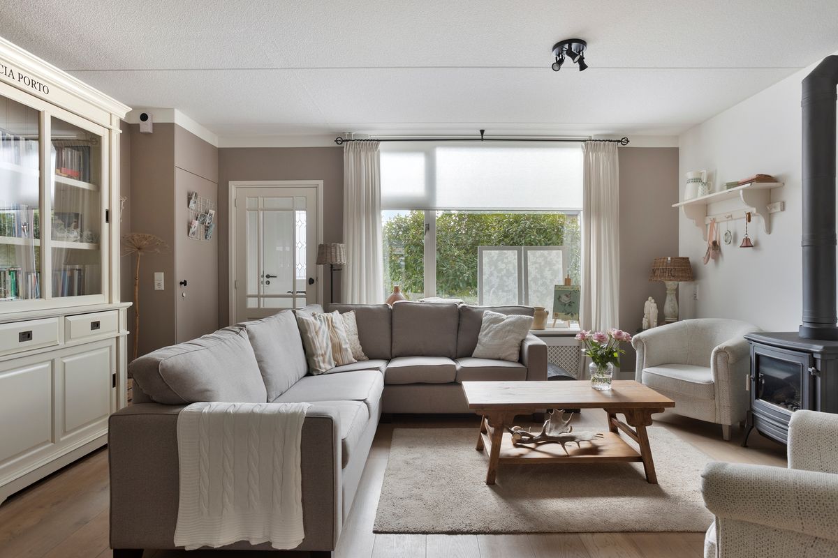 Via de hal stap je de lichte woonkamer binnen. De eikenhouten vloer en de gaskachel zorgen voor een warme, huiselijke sfeer. Handig is ook de trapkast voor extra bergruimte. De woonkamer loopt over in de uitgebouwde keuken, waar je direct het gevoel van ruimte en licht ervaart. De moderne inbouwkeuken is compleet uitgerust en dankzij de ramen tot aan de grond geniet je hier van volop daglicht en uitzicht op de tuin. De openslaande terrasdeuren maken het binnen-buitengevoel helemaal compleet. Grenzend aan de keuken vind je de bijkeuken, voorzien van een praktisch keukenblokje, inbouwkast en een deur naar de voortuin en oprit. Vanuit de bijkeuken is ook de berging bereikbaar. Achter deze berging bevindt zich nog een tweede, dubbele berging, perfect voor fietsen, tuingereedschap of een werkbank. Centraal in de woning bevindt zich een tussenhal met de toiletruimte, voorzien van een zwevend toilet, fonteintje en meubel. Ook vind je hier een diepe inbouwkast met aansluitingen voor de wasmachine en droger. Dankzij de uitbouw bieden de woonkamer en keuken samen maar liefst 50 m² aan woonruimte.