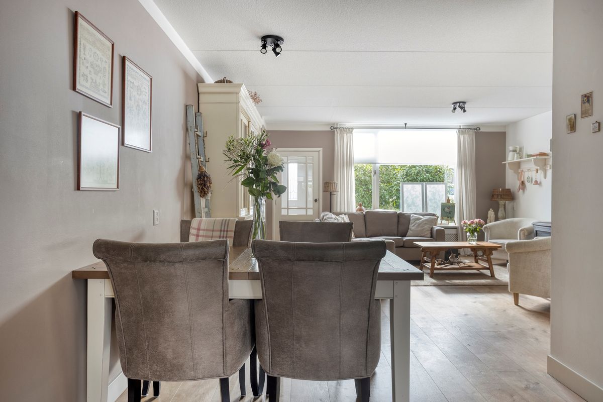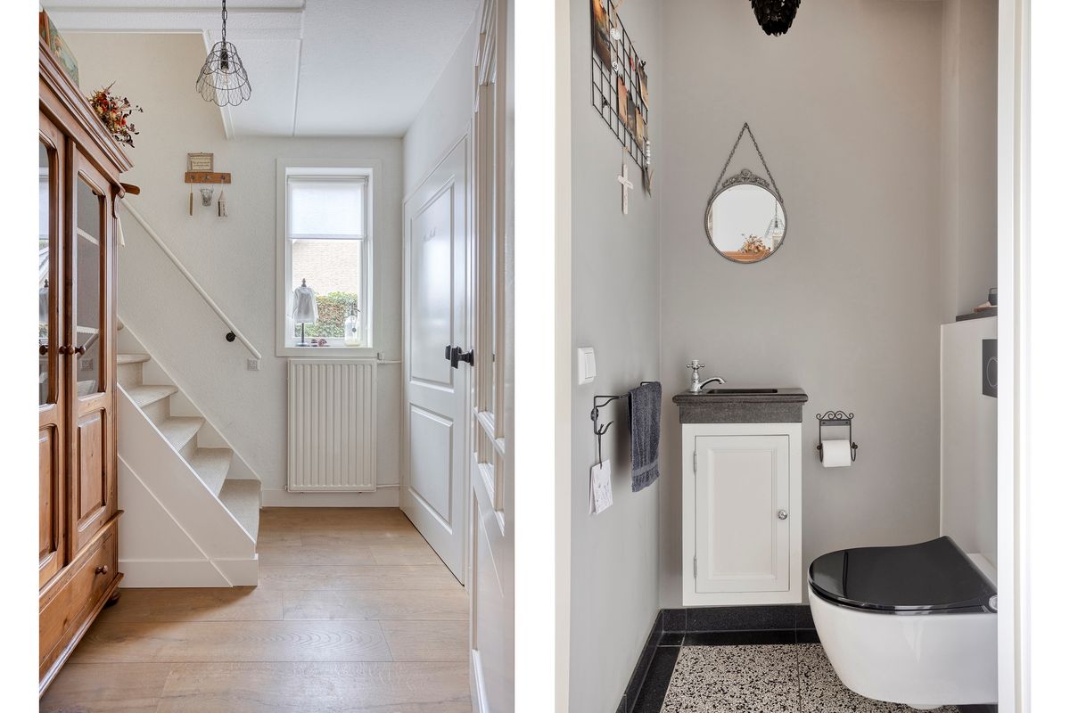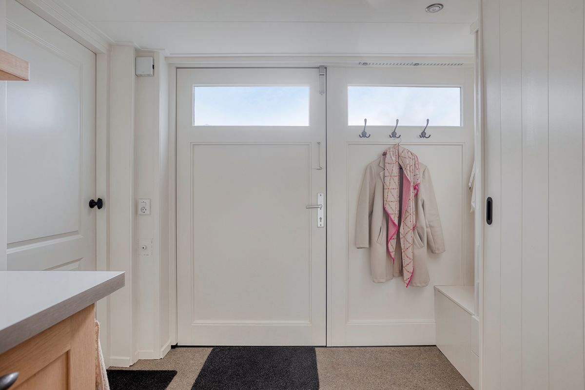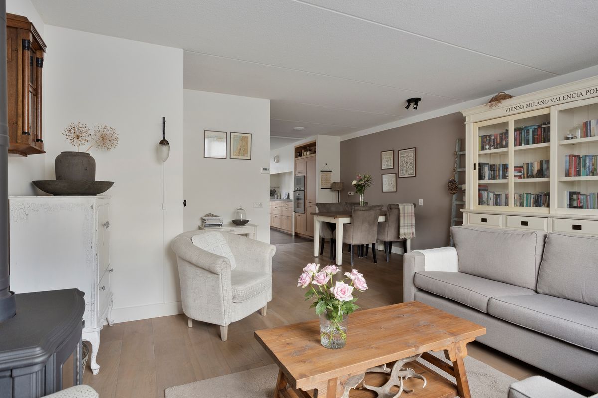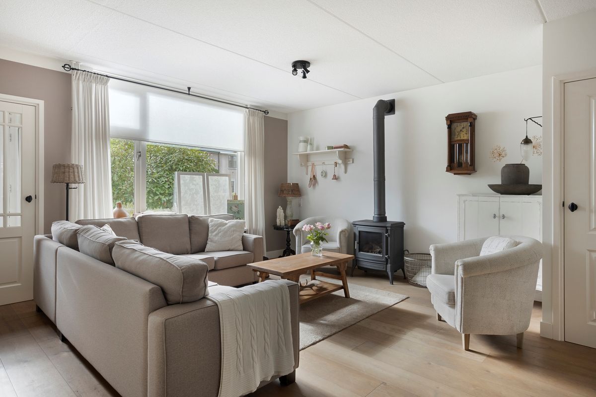 Via de hal stap je de lichte woonkamer binnen. De eikenhouten vloer en de gaskachel zorgen voor een warme, huiselijke sfeer. Handig is ook de trapkast voor extra bergruimte. De woonkamer loopt over in de uitgebouwde keuken, waar je direct het gevoel van ruimte en licht ervaart. De moderne inbouwkeuken is compleet uitgerust en dankzij de ramen tot aan de grond geniet je hier van volop daglicht en uitzicht op de tuin. De openslaande terrasdeuren maken het binnen-buitengevoel helemaal compleet. Grenzend aan de keuken vind je de bijkeuken, voorzien van een praktisch keukenblokje, inbouwkast en een deur naar de voortuin en oprit. Vanuit de bijkeuken is ook de berging bereikbaar. Achter deze berging bevindt zich nog een tweede, dubbele berging, perfect voor fietsen, tuingereedschap of een werkbank. Centraal in de woning bevindt zich een tussenhal met de toiletruimte, voorzien van een zwevend toilet, fonteintje en meubel. Ook vind je hier een diepe inbouwkast met aansluitingen voor de wasmachine en droger. Dankzij de uitbouw bieden de woonkamer en keuken samen maar liefst 50 m² aan woonruimte.