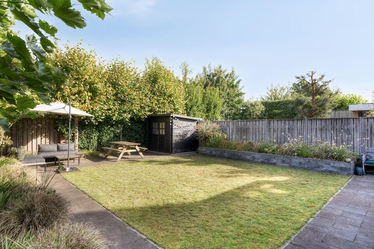 De achtertuin is verzorgd aangelegd en gesitueerd op het noordwesten. Hier kun je de hele dag door genieten van verschillende zitplekken, een groen gazon en kleurrijke plantenborders. Onder de gezellige overkapping met verlichting is het goed toeven, ook op zomeravonden. Tot slot is er een vrijstaande houten berging voor extra opslagruimte.