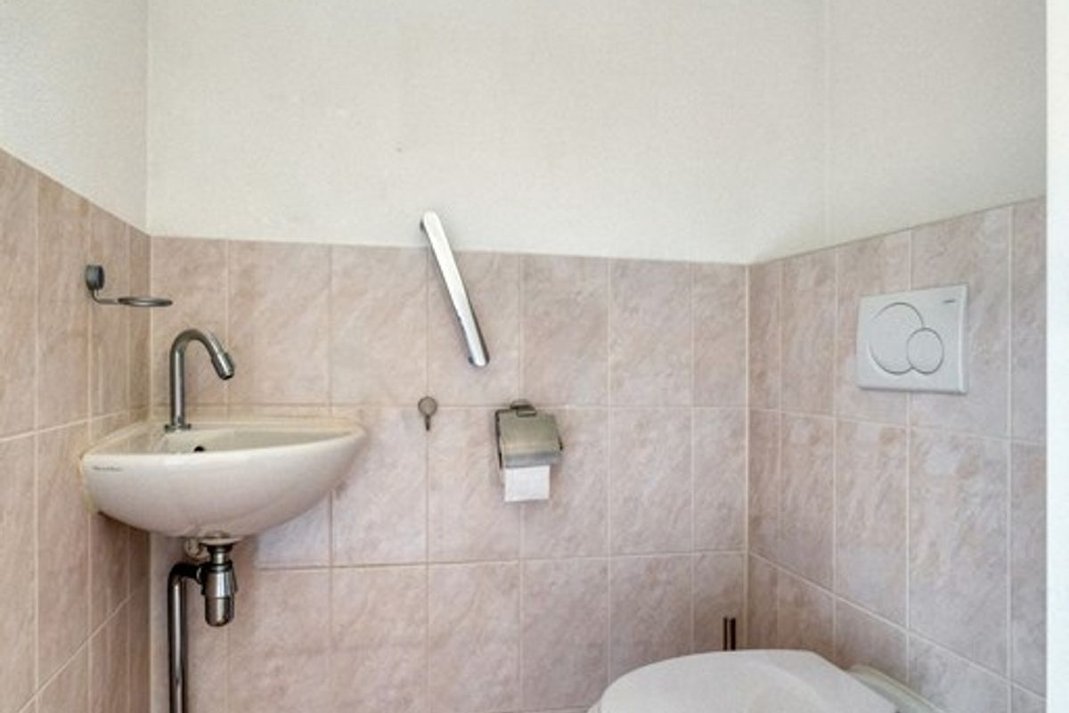 Aan de achterzijde van het appartement ligt de slaapkamer, die ruim genoeg is voor een tweepersoonsbed en is voorzien van een grote ingebouwde kast. Grenzend aan de slaapkamer vind je de badkamer, uitgerust met een wastafel en douche.