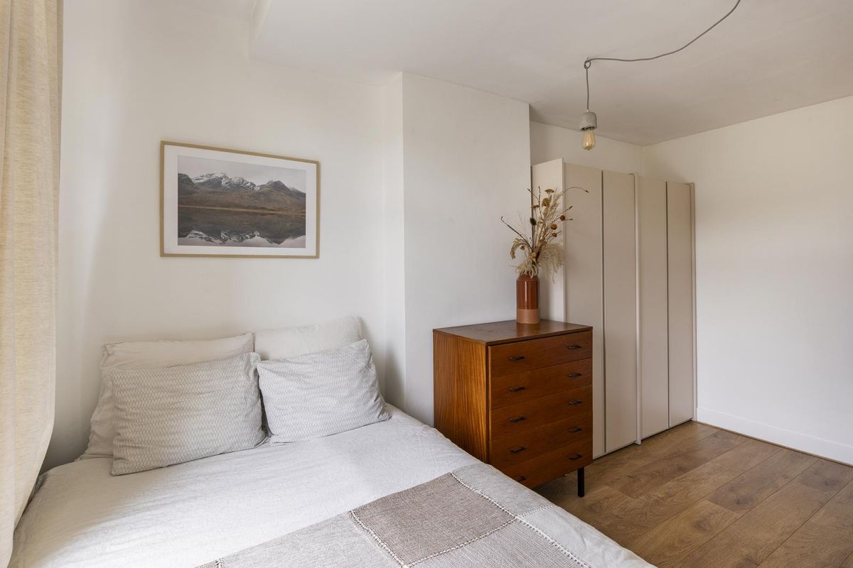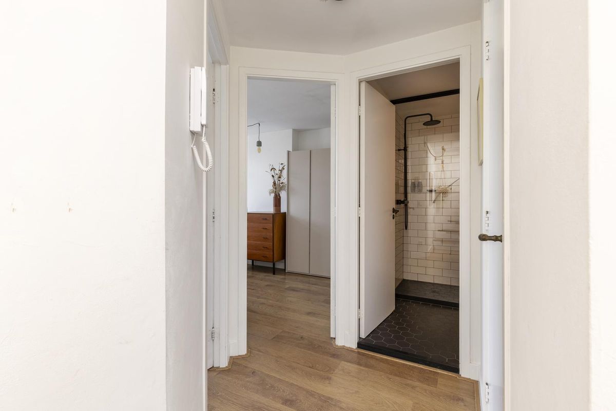 U komt binnen in de hal met toegang tot het toilet, een praktische berging met aansluitingen voor de wasmachine en droger en de woonkamer. Aan de voorzijde bevindt zich de woonkamer met een Frans balkon en een sfeervolle open haard. Grenzend aan de woonkamer bevindt zich een compacte kamer van circa 4 m², ideaal als thuiskantoor of derde slaapkamer. Aan de achterzijde bevindt zich de open keuken met kookeiland. De keuken is voorzien van een groot gasfornuis, koelkast, vriezer en vaatwasser.