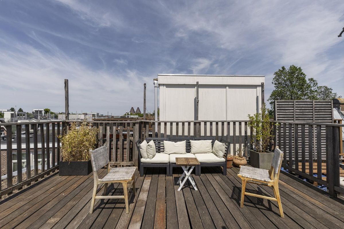 Via een vaste trap bereikt u het zonnige privédakterras van circa 25 m², waar u heerlijk kunt loungen, zonnen of barbecueën.