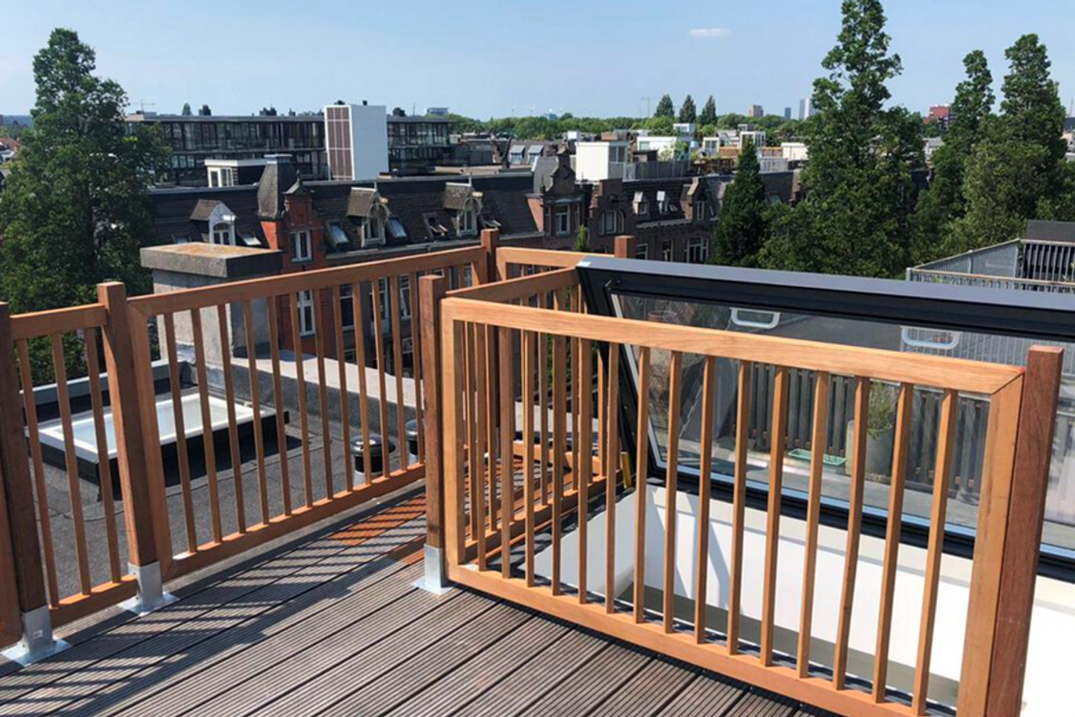 From the entrance hall, a staircase leads to the private roof terrace, offering breathtaking panoramic views of the city—including the Westertoren, Rijksmuseum, and Vondelpark.