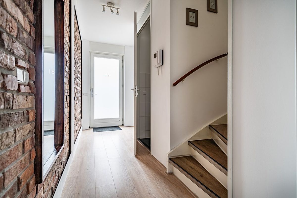 Via de groene binnentuin bereikt u het eigen terras en de voordeur van de woning. De ruime hal biedt toegang tot de garderobe, meterkast, modern toilet met fonteintje en een handige trapkast met extra bergruimte.